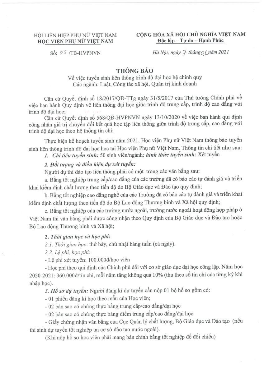 Thông báo tuyển sinh liên thông đại học ngành: Luật, CTXH, QTKD