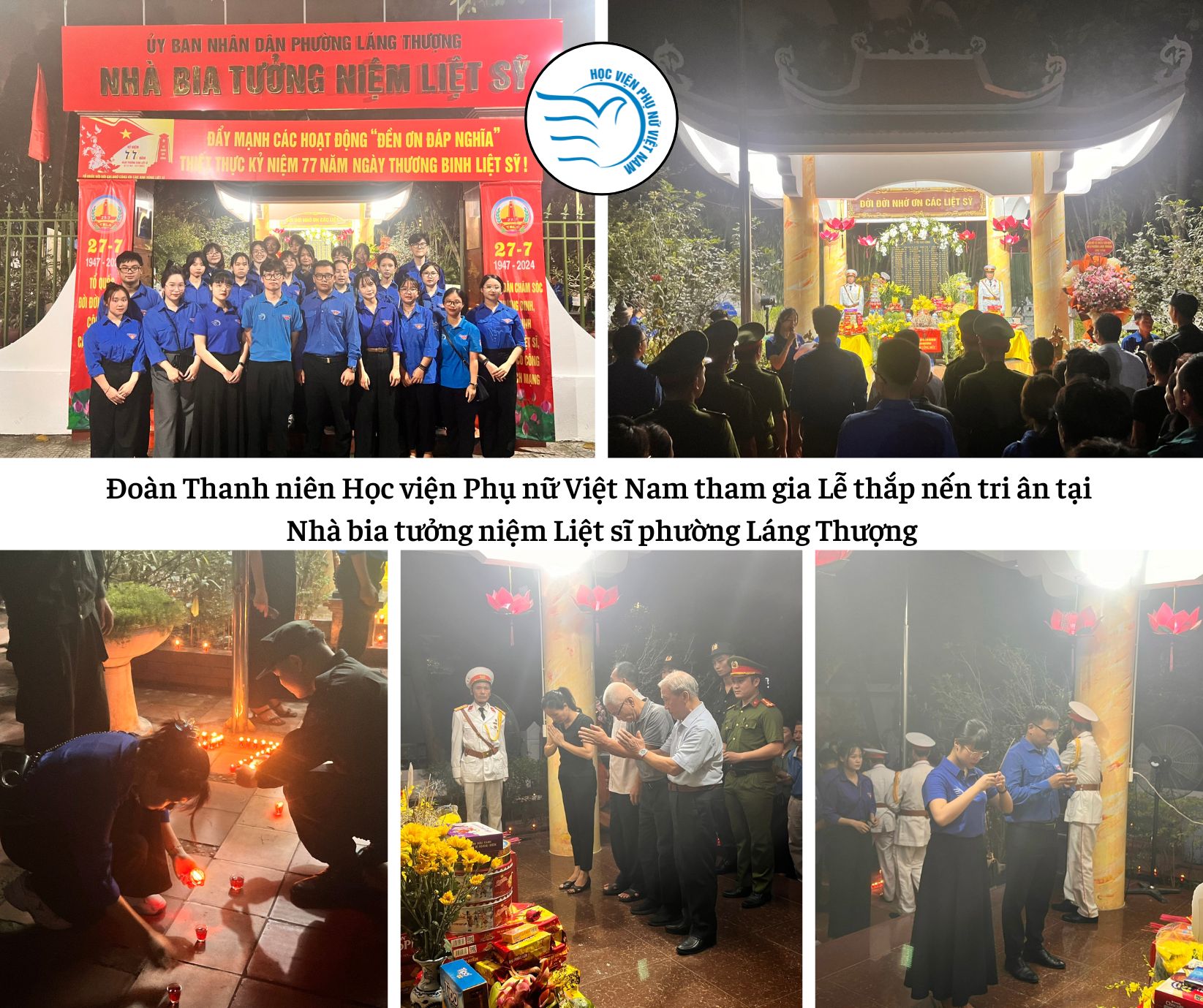 Vào buổi tối cùng ngày, Đoàn Thanh niên Học viện Phụ nữ Việt Nam cùng các đơn vị kết nghĩa đã tham gia Lễ thắp nến tri ân tại Nhà bia tưởng niệm Liệt sĩ phường Láng Thượng. Ánh nến lung linh trong đêm tối như những ngọn lửa của lòng biết ơn, thắp sáng tâm hồn tuổi trẻ và làm ấm lòng những anh hùng đã khuất.
