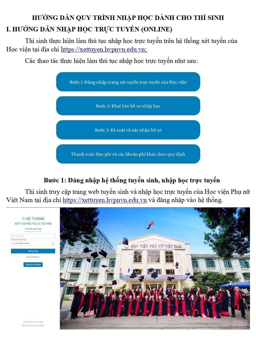 ✍ Bước 3: Thí sinh nhập học trực tiếp tại Học viện Phụ nữ Việt Nam. Thời gian nhập học từ ngày 19/8/2024 đến trước 17 giờ 00 ngày 27/8/2024. Hồ sơ nhập học thí sinh cần chuẩn bị xem TẠI ĐÂY