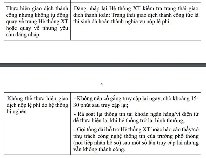 Trong trường hợp thí sinh/phụ huynh đã nhận được thông báo trừ tiền (trong tài khoản ngân hàng/ví điện tử đang sử dụng) mà không nhận được thông báo thành công trên Hệ thống xét tuyển, đề nghị thí sinh/phụ huynh liên hệ số điện thoại đường dây nóng của kênh thanh toán hoặc tổng đài Hệ thống xét tuyển để phản ánh và nhận hỗ trợ kiểm tra, hướng dẫn. Trong trường hợp này, Bộ Giáo dục và Đào tạo đề nghị thí sinh không tự ý tiếp tục thanh toán. Trường hợp xảy ra thanh toán trùng thì thí sinh sẽ được hoàn tiền thanh toán trùng sau khi kết thúc đợt nộp lệ phí.