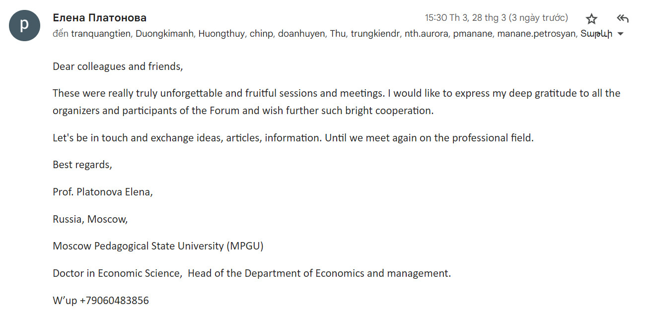 Tạm biệt Việt Nam, các đại biểu trở về quê hương trên khắp mọi miền Á – Âu, hình ảnh đất nước Việt Nam với những người bạn hiếu khách tại Học viện Phụ nữ Việt Nam đã để lại nhiều ấn tượng tốt đẹp trong lòng bạn bè quốc tế.