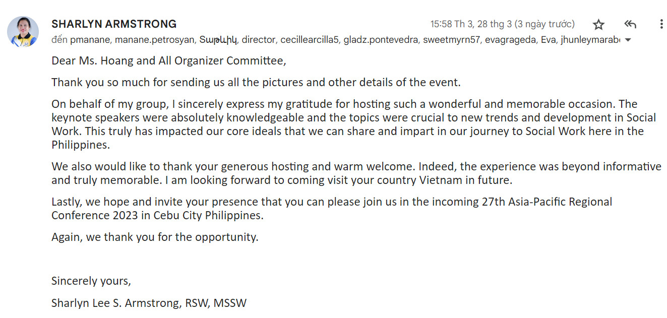 Hội thảo đã ghi nhận được nhiều trao đổi ý nghĩa, quý báu và thực sự là diễn đàn trao đổi học thuật và giao lưu mở rộng quan hệ hợp tác quốc tế trong lĩnh vực nghiên cứu, đào tạo Công tác xã hội và ghi nhận, tôn vinh những đóng góp của nhân viên Công tác xã hội trong phát triển xã hội.