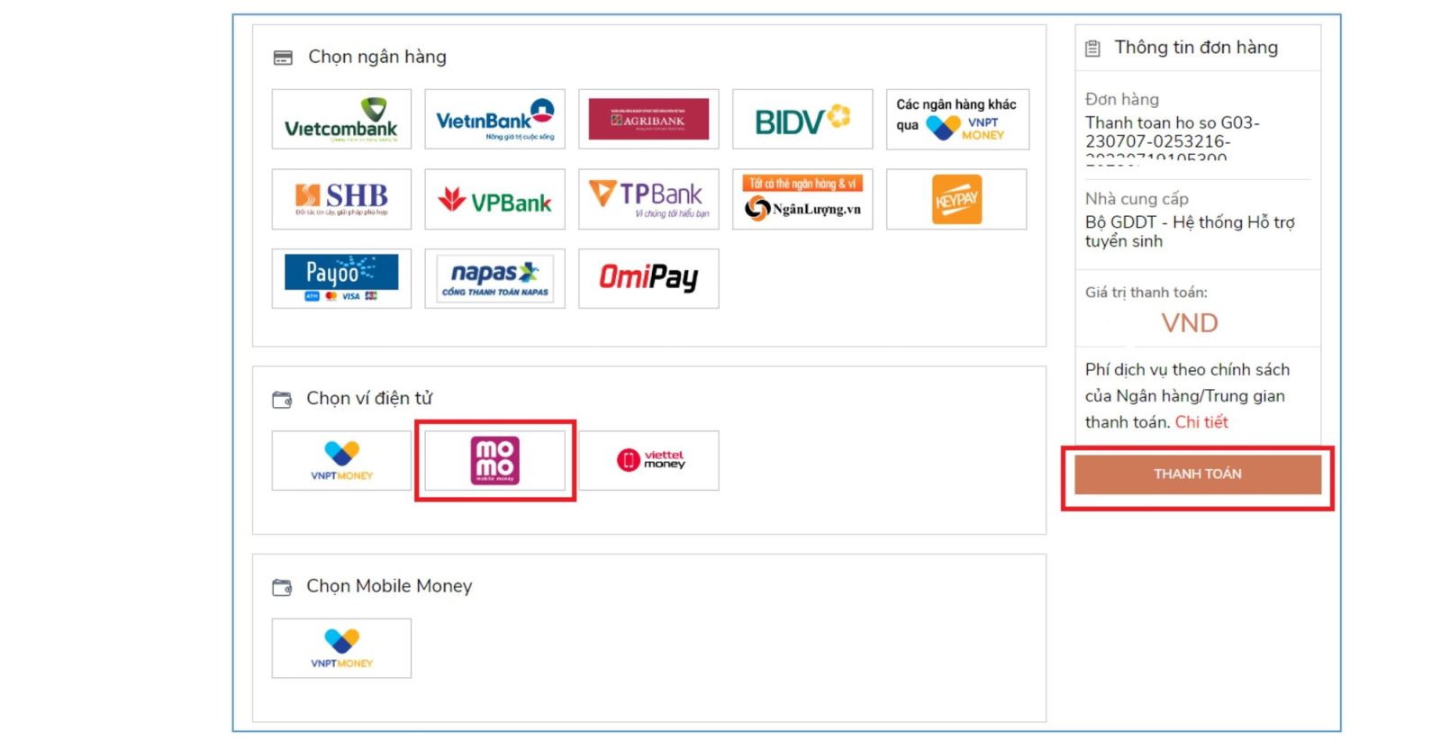 – Thí sinh có thể tự thanh toán bằng tài khoản ngân hàng/tài khoản ví điện tử của bản thân (nếu có) hoặc nhờ người thân, thầy/cô giáo thanh toán hộ trên giao diện thanh toán của thí sinh.