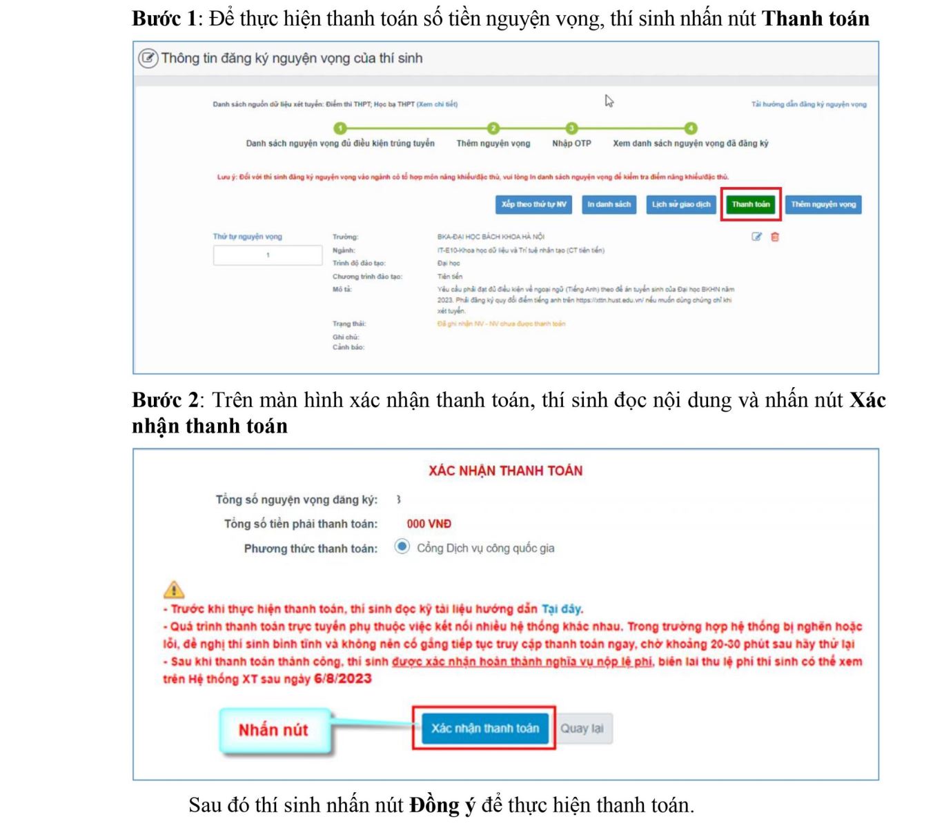 – Trong trường hợp thí sinh không nhìn thấy nút “Thanh toán” tại giao diện đăng ký nguyện vọng xét tuyển có nghĩa là thời điểm đó không thuộc khoảng thời gian nộp lệ phí hoặc đang được tạm ẩn đi nhằm chống nghẽn hệ thống thanh toán.