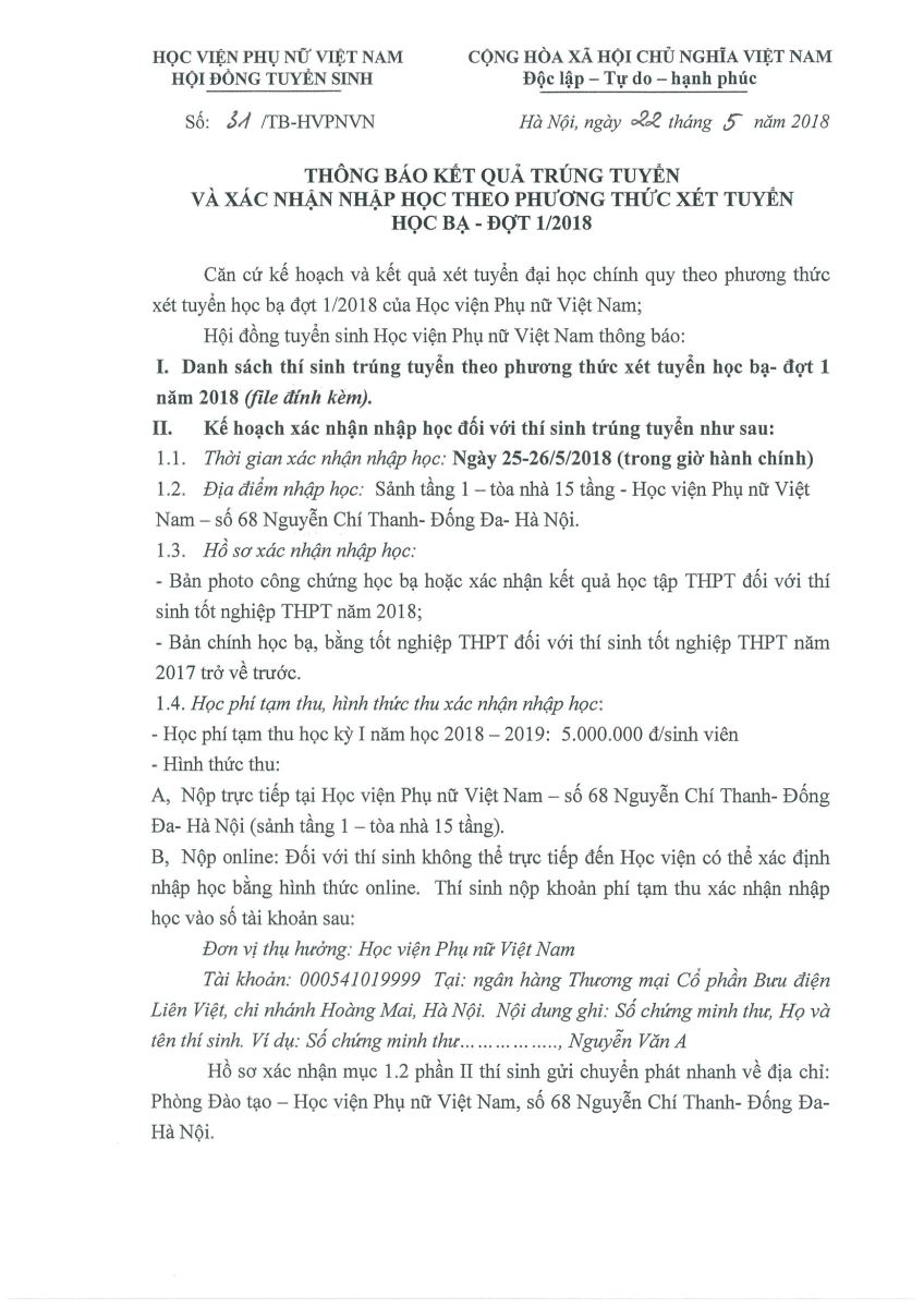 DANH SÁCH THÍ SINH TRÚNG TUYỂN ĐỢT I NĂM 2018 (Theo hình thức xét học bạ)