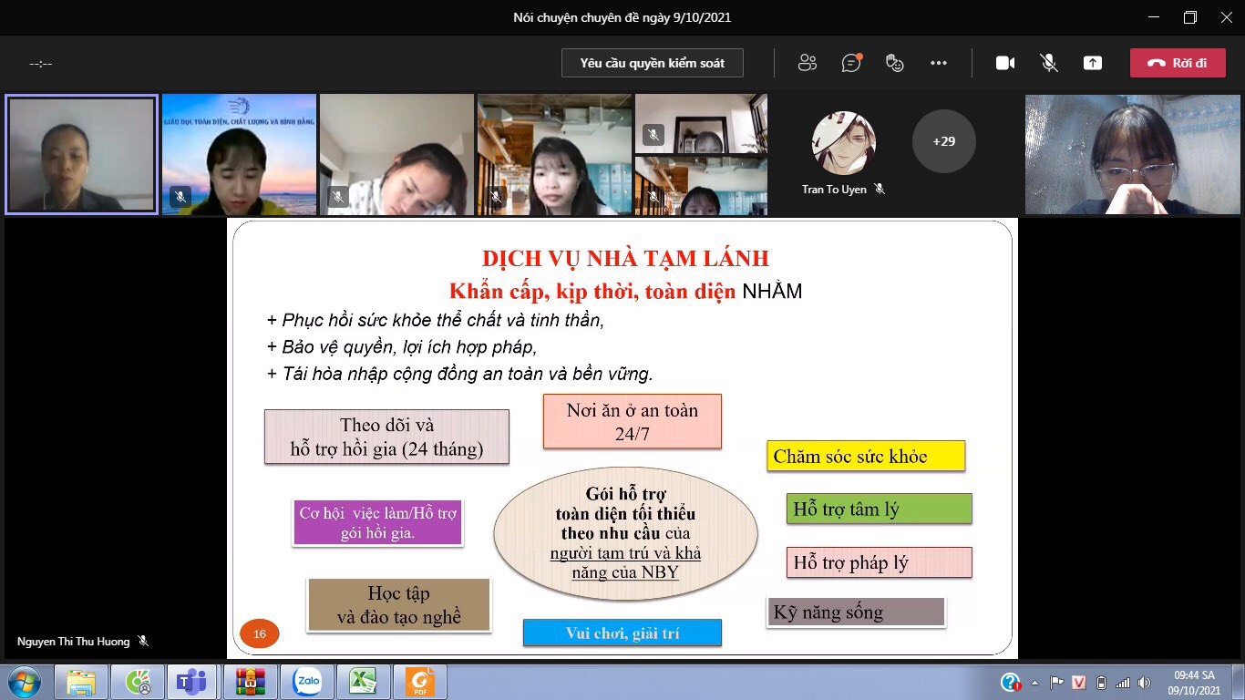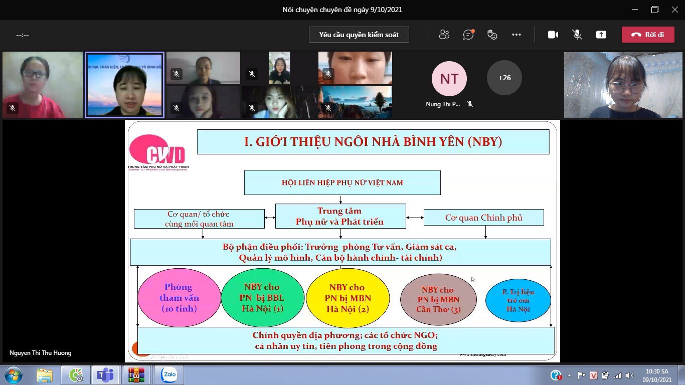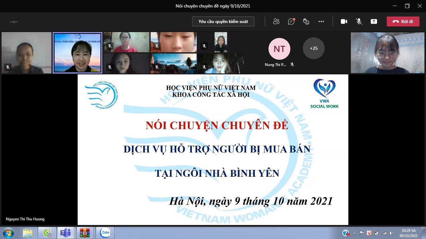 Buổi nói chuyện chuyên đề được tổ chức bằng hình thức trực tuyến với sự tham gia của báo cáo viên Hà Minh Ngọc – người có 15 năm kinh nghiệm làm việc trong lĩnh vực hỗ trợ nạn nhân bị mua bán, cùng các giảng viên, sinh viên khoa Công tác xã hội và những người quan tâm đến lĩnh vực Công tác xã hội.