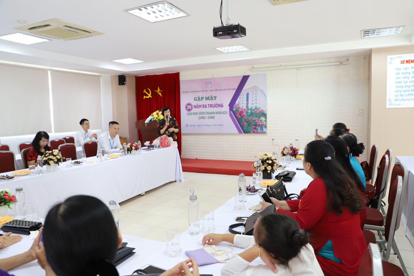 Tại buổi gặp mặt, thay mặt các cựu học viên, bác Lê Thị Tảo – Trưởng Đoàn cựu học viên K25 – Đoàn Thanh Hoá đã báo cáo khái quát sự trưởng thành của các học viên của khoá tại Thanh Hoá cũng như có những chia sẻ rất chân tình sau thời gian dài về thăm lại trường cũ. Bác bày tỏ mong muốn của cả đoàn về kế hoạch gặp gỡ kỉ niệm 40 năm ngày ra trường vào năm 2024 và mong muốn buổi gặp gỡ hôm nay sẽ là nền tảng để lớp khởi động tinh thần, kết nối liên lạc với các chị em cùng khoá trên mọi miền tổ quốc.