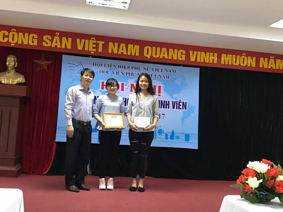 TS. Trần Quang Tiến, Giám đốc Học viện Phụ nữ Việt Nam trao giải Nhất Nghiên cứu khoa học sinh viên năm 2017 cho sinh viên khoa Công tác xã hội