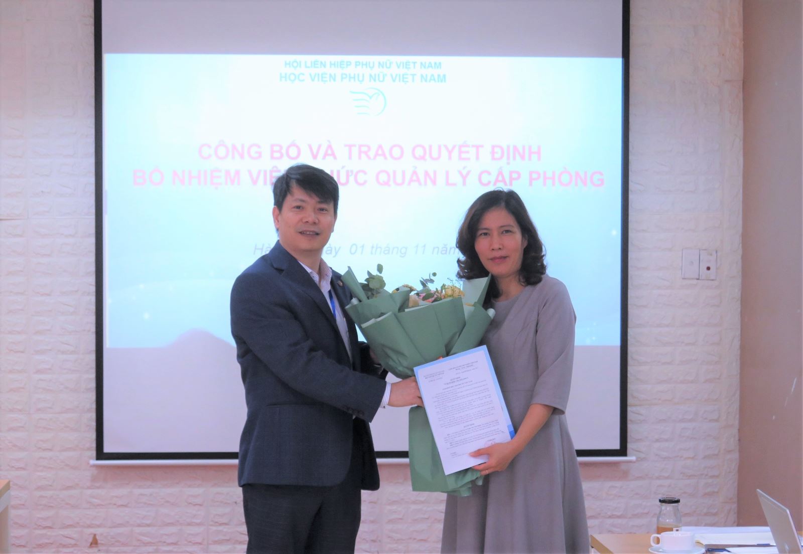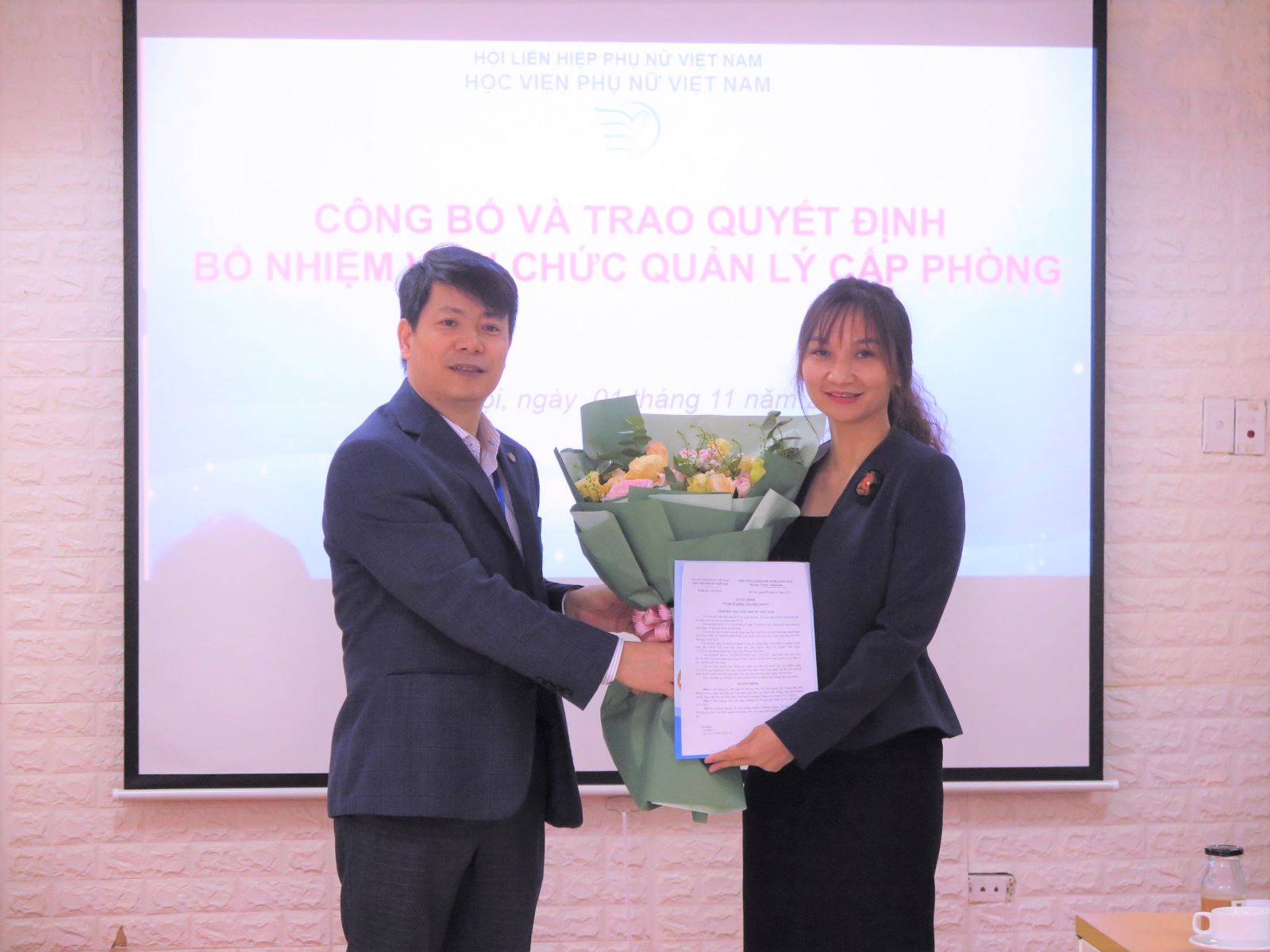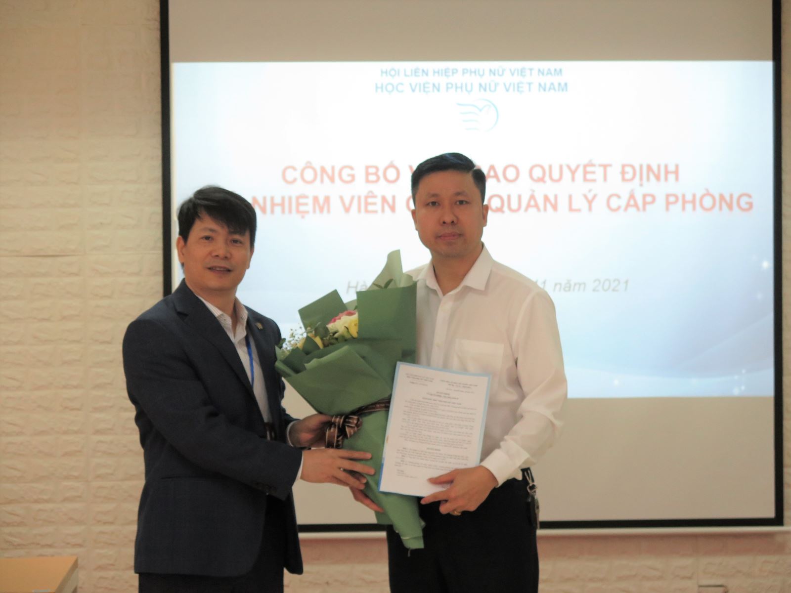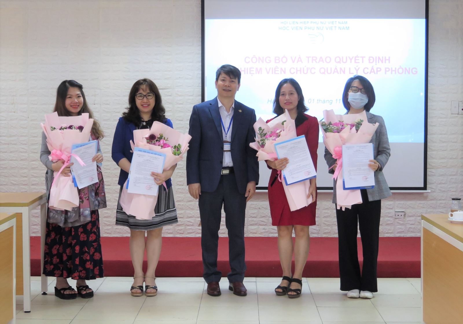 Cũng tại buổi lễ, Giám đốc Học viện Phụ nữ Việt Nam cũng chúc mừng các đồng chí được bổ nhiệm vào vị trí lãnh đạo cấp phó các đơn vị từ tháng 8/2021 nhưng do ảnh hưởng của dịch Covid 19 nên chưa thực hiện lễ trao quyết định trực tiếp: