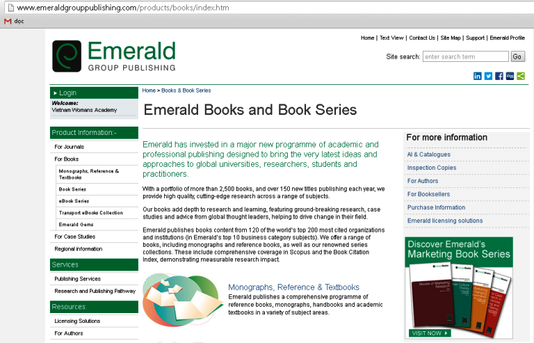 Nhằm mở rộng nguồn khai thác tài liệu phục vụ công tác nghiên cứu, giảng dạy và học tập của cán bộ giảng viên, nghiên cứu viên và sinh viên, Học viện Phụ nữ Việt Nam đã mua trọn gói Emerald ebooks Series.