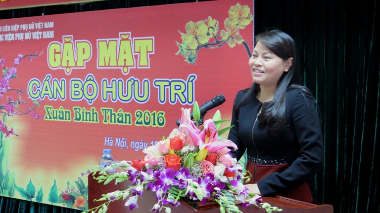 Vui mừng trở lại Học viện sau thời gian công tác biệt phái tại tỉnh Vĩnh Long, Phó Chủ tịch Hội LHPN VN,TS.Nguyễn Thị Thu Hà bày tỏ niềm xúc động khi được trở lại mái trường xưa, đượcsống trong tình cảm thương mến cùng các thế hệ đi trước và đồng nghiệp hiện tại. Đồng chí cũng gửi lời cảm ơn các cán bộ hưu đã luôn ủng hộ, động viên, tận tình chỉ bảo cho từng bước đường phấn đấu của cá nhân và sự phát triển chung của Học viện, của Hội LHPN Việt Nam. Nhân dịp đầu xuân Bính Thân 2016, đồng chí kính chúc sức khỏe, hạnh phúc đến toàn thể các cán bộ đã nghỉ hưu cũng như các đồng nghiệp đã và đang phấn đấu xây dựng Học viện Phụ nữ Việt Nam ngày càng vững vàng, bề thế hơn.