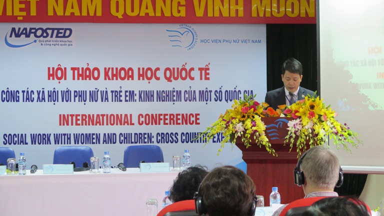 Phát biểu khai mạc hội thảo, TS. Trần Quang Tiến khẳng định: Trong bối cảnh đất nước đang bước vào thời kỳ đẩy mạnh công nghiệp hóa, hiện đại hóa và quá trình toàn cầu hóa, Công tác xã hội ngày càng có vai trò to lớn trong việc trợ giúp cá nhân, gia đình, nhóm người trong cộng đồng và các hệ thống xã hội nhằm đạt được sự thay đổi về mặt xã hội, giải quyết các vấn đề trong mối quan hệ với con người và nâng cao an sinh xã hội. Đặc biệt, trong nhóm các đối tượng yếu thế, phụ nữ và trẻ em đang tiếp tục phải đối mặt với rất nhiều khó khăn, thách thức; đòi hỏi có sự quan tâm, hỗ trợ từ góc độ công tác xã hội. Hội thảo “Công tác xã hội với phụ nữ và trẻ em – Kinh nghiệm của một số quốc gia” là diễn đàn khoa học có ý nghĩa đặc biệt quan trọng trong việc trao đổi, chia sẻ kinh nghiệm về công tác xã hội đối với phụ nữ và trẻ em đồng thời góp phần đẩy mạnh mối quan hệ hợp tác trong đào tạo nghề Công tác xã hội giữa Học viện Phụ nữ Việt Nam với các trường có đào tạo nghề Công tác xã hội trên thế giới và trong nước.