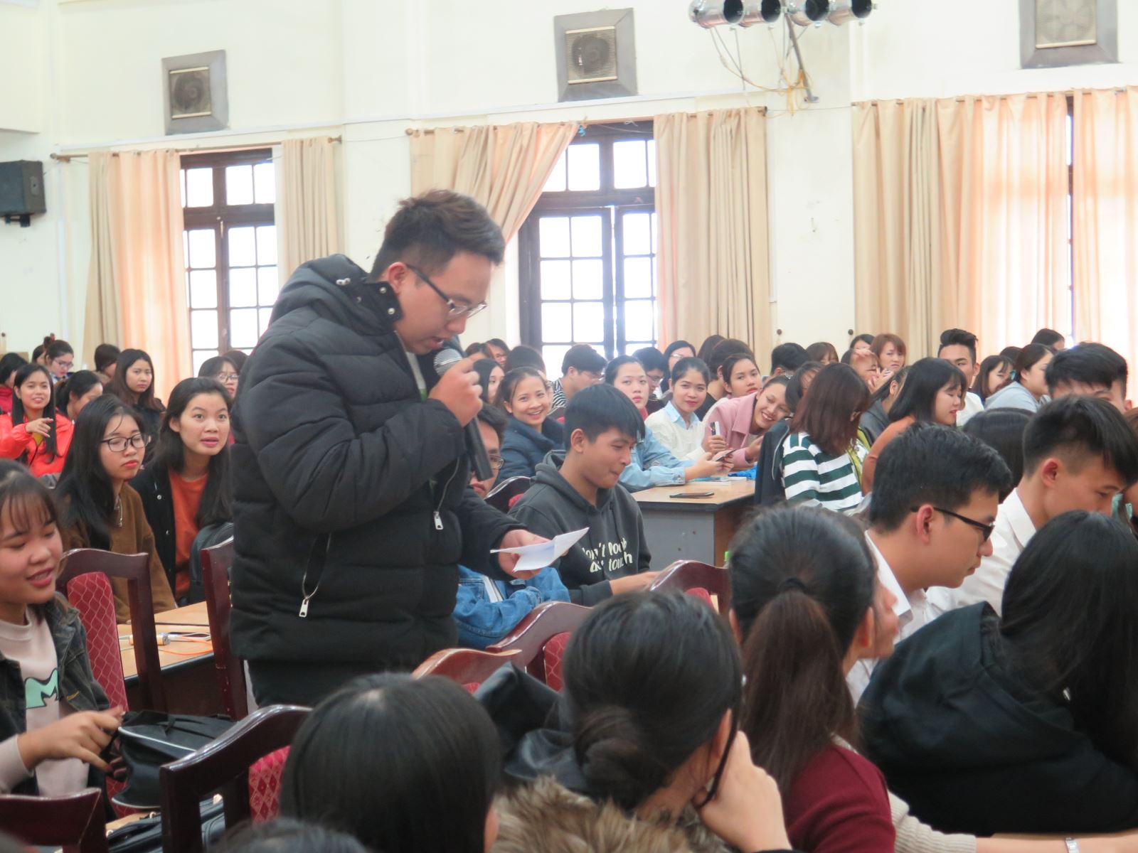Phát biểu khai mạc Hội nghị, TS.Trần Quang Tiến khẳng định hội nghị có ý nghĩa  trực tiếp phản hồi những thông tin, giải đáp thắc mắc và đề xuất của sinh viên theo phương châm kịp thời, đúng, trúng vấn đề và sát thực tễ. Thông qua hội nghị, ngoài những câu hỏi đã gửi, sinh viên có cơ hội trực tiếp nêu ý kiến, đề đạt nguyện vọng với nhà trường.