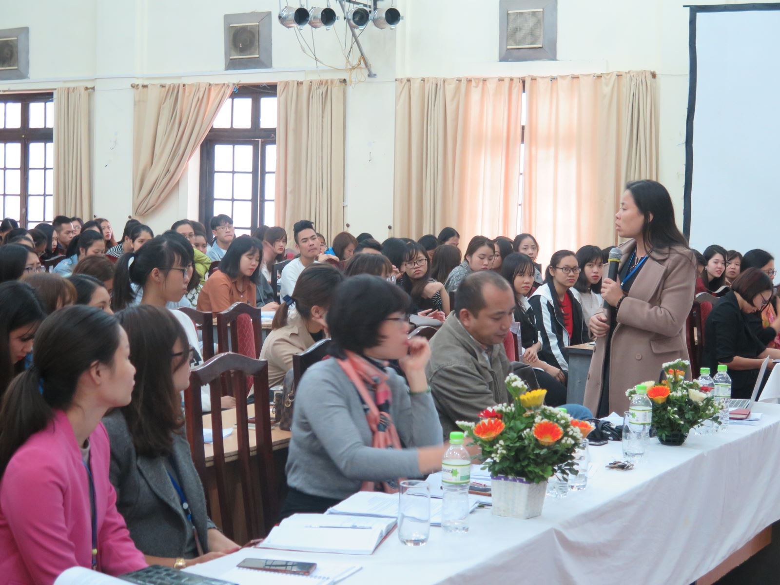 Tại hội nghị, đại diện Ban Giám đốc, phòng Đào tạo, Phòng Công tác sinh viên, phòng Quản trị cơ sở vật chất, Đoàn Thanh niên…đã giải đáp 70 câu hỏi của sinh viên về chương trình đào tạo và các hoạt động đào tạo (quy chế đào tạo, nội dung chương trình đào tạo, các chuyên ngành đào tạo, chất lượng giảng dạy, tổ chức thi cử…); công tác nghiên cứu khoa học trong sinh viên (quy chế nghiên cứu khoa học sinh viên, chính sách hỗ trợ sinh viên nghiên cứu khoa học, quyền lợi và trách nhiệm của sinh viên nghiên cứu khoa học…); những vấn đề liên quan đến cơ sở vật chất (giảng đường, phòng học, các phòng sinh hoạt tập thể, các vấn đề về dịch vụ và môi trường khu nội trú sinh viên, công tác y tế, vệ sinh và an ninh trật tự…); công tác sinh viên (công tác giáo dục, tuyên truyền; công tác quản lý sinh viên; hỗ trợ và các dịch vụ sinh viên; công tác sinh viên nội trú…); môi trường văn hóa sư phạm (việc thực hiện qui chế, qui định, lề lối tác phong giảng dạy, học tập, giao tiếp ứng xử văn hóa…); chương trình hoạt động của Đoàn Thanh niên (việc triển khai các hoạt động Đoàn, công tác phát triển Đảng,…); các hoạt động văn hóa, văn nghệ, thể dục thể thao; công tác tra cứu và tìm tư liệu học tập; Wifi ký túc xá…