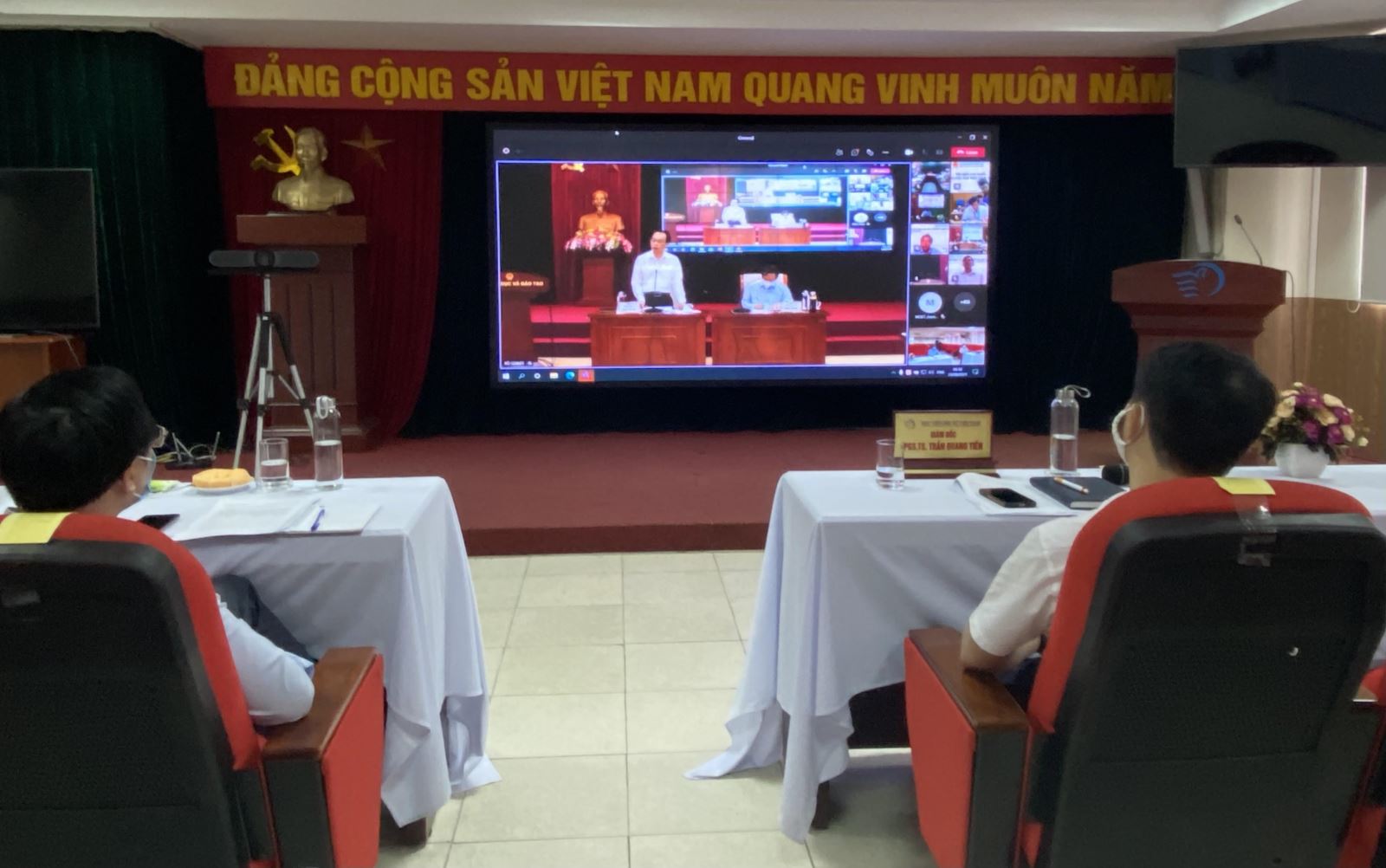 Điểm cầu Học viện Phụ nữ Việt Nam có sự tham gia của PGS.TS Trần Quang Tiến, Bí thư đảng uỷ, Giám đốc Học viện; TS.Dương Kim Anh, Phó Giám đốc Học viện và lãnh đạo một số khoa phòng chuyên môn.