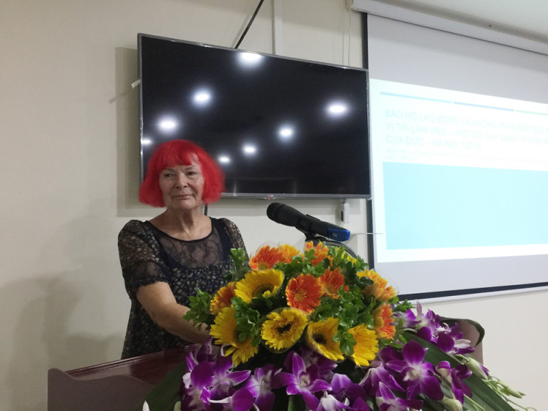 Để chia sẻ sâu hơn về hai vấn đề nêu trên, bà Christa Randzio Plath đã tham luận về chống phân biệt đối xử tại nơi làm việc gắn với các mục tiêu phát triển bền vững – thực tiễn triển khai ở Cộng hòa Liên Bang Đức và chương trình Nghị sự phát triển bền vững của Liên Hiệp Quốc (SDG) – việc triển khai ở Đức và vấn đề giới.. Theo bà, tại Đức có luật bảo vệ người lao động quy định vấn đề chống quấy rối tình dục ở nơi làm việc; bảo vệ lao động nữ trước các hành vi quấy rối tình dục, và không chỉ giới hạn ở không gian tại văn phòng, tòa nhà, cơ quan doanh nghiệp hoặc trong thời gian làm việc, mà còn ở các không gian, hình thức khác, như ở các chuyến đi công tác, trên đường đi tới nơi làm việc, các tin nhắn, email, điện thoại…Người sử dụng lao động phải có trách nhiệm bảo vệ người lao động, phải để nơi làm việc trở thành môi trường an toàn cho tất cả mọi người lao động, nhất là lao động nữ. Người lao động có quyền được khiếu nại, từ chối làm việc và đòi bồi thường thiệt hại…trong trường hợp bị quấy rối tình dục và người quấy rối sẽ bị sa thải vô thời hạn.