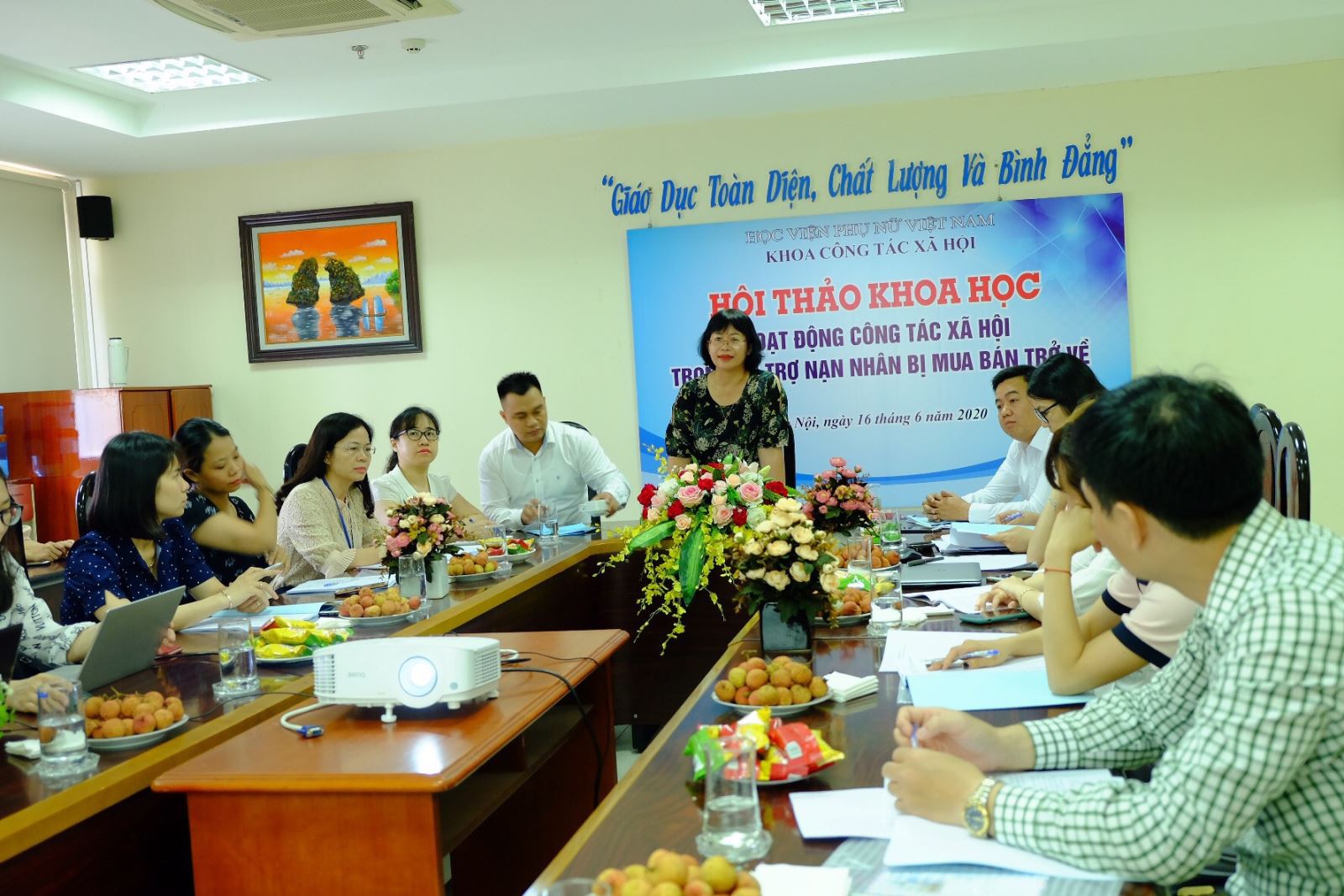 Phát biểu khai mạc, TS. Dương Kim Anh – Phó Giám đốc Học viện Phụ nữ Việt Nam đã nêu lên tầm quan trọng của công tác xã hội trong hỗ trợ cho nạn nhân bị mua bán trở về. Với quan điểm “không ai bị bỏ lại phía sau”, công tác xã hội hướng đến hỗ trợ toàn diện cho nạn nhân bị mua bán trở về để họ được phục hồi chức năng xã hội và hòa nhập cộng đồng.