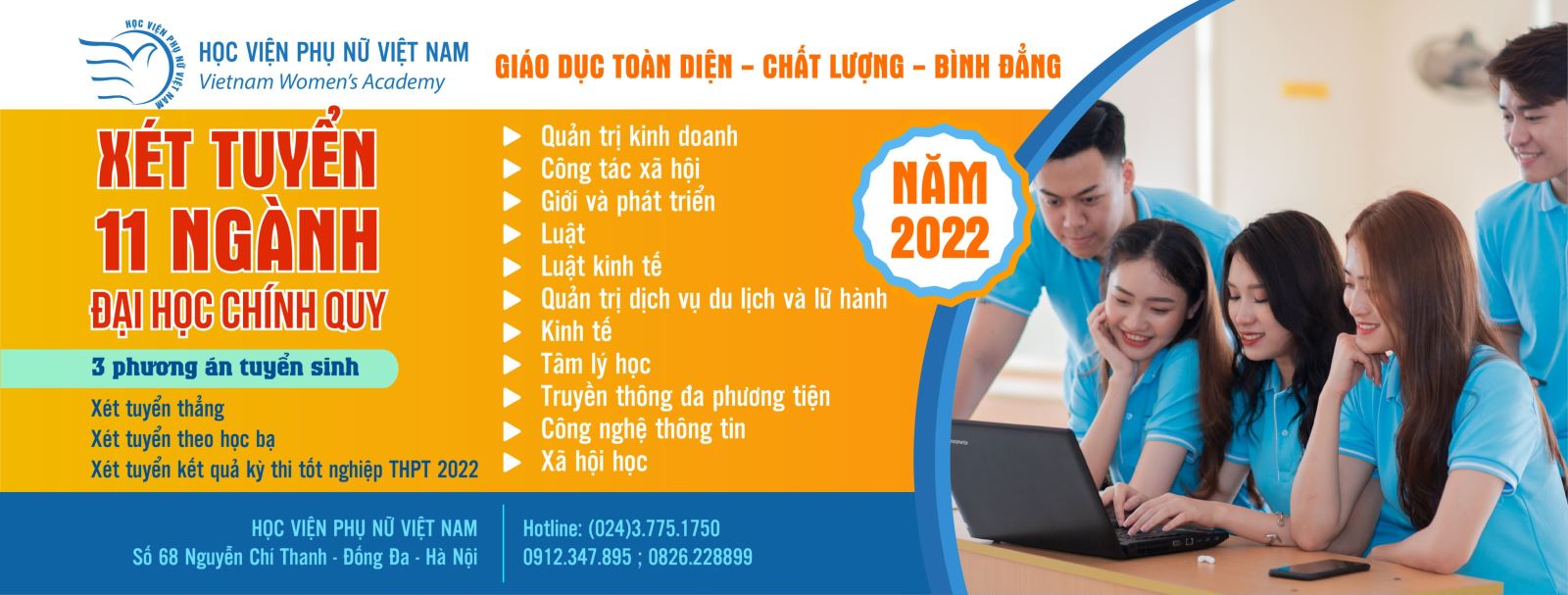 Lưu ý: Kết quả trúng tuyển đại học năm 2022 được tính dựa trên cổng thông tin của Bộ GD-ĐT. Vì vậy, nếu đã nộp hồ sơ xét tuyển trước đó tại Học viện Phụ nữ Việt Nam, thí sinh cũng cần điền thông tin trên hệ thống của Bộ GD-ĐT để được công nhận. Nếu yêu thích 11 ngành đào tạo của Học viện Phụ nữ Việt Nam, các thí sinh hãy chọn HPN là nguyện vọng 1.