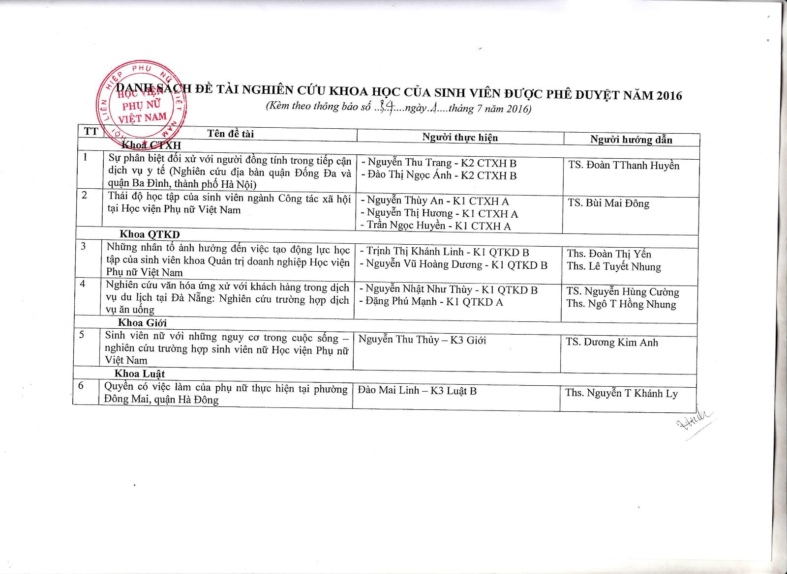 Kết quả xét duyệt đề xuất Đề tài NCKH của sinh viên