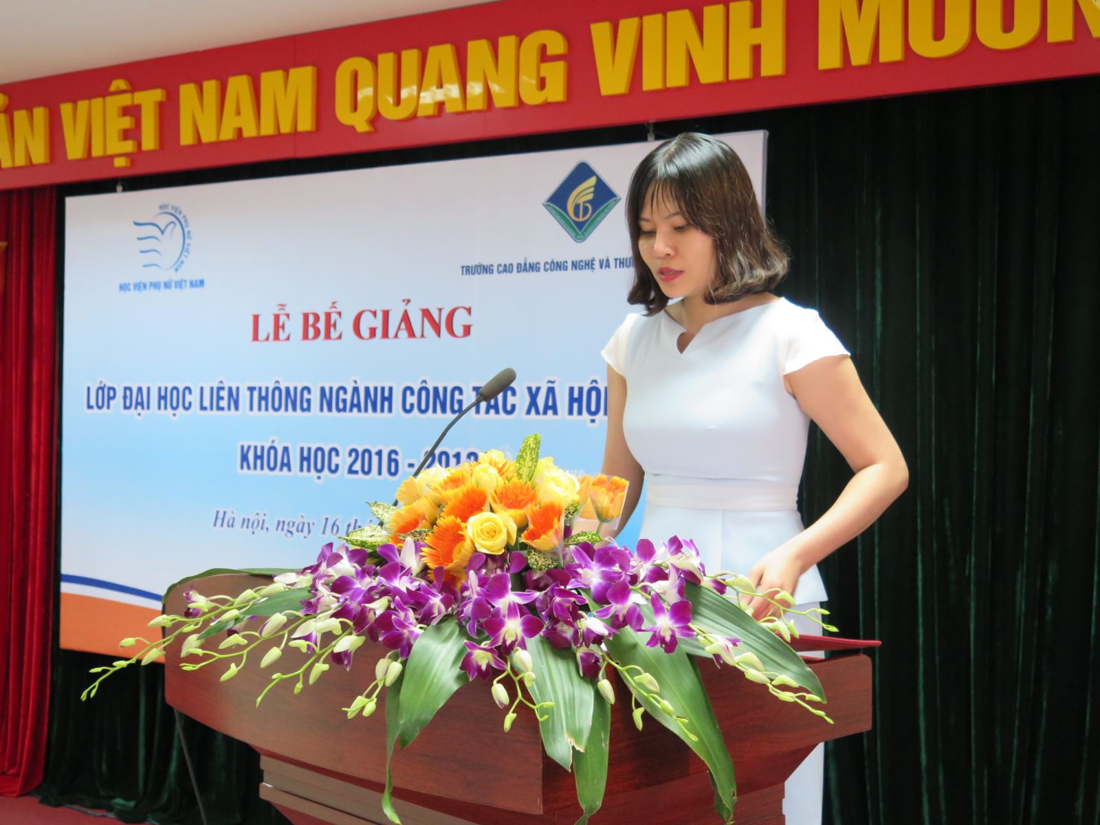 Tại lễ bế giảng, Ths. Nguyễn Thị Vui – Giảng viên Trường cao đẳng Công nghệ và Thương mại, giáo viên chủ nhiệm lớp đã đọc báo cáo tổng kết lớp liên thông Cao đẳng – đại học chính quy ngành Công tác xã hội khóa học 2016 – 2018.