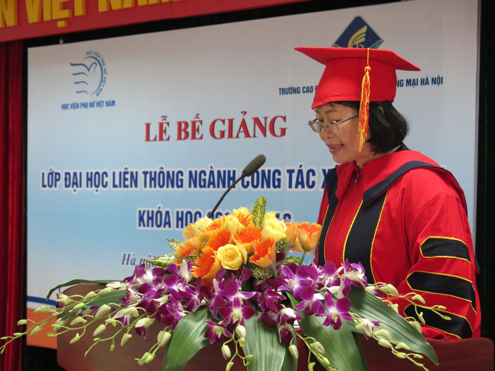 Phát biểu chúc mừng các sinh viên, Phó Giám đốc Dương Kim Anh khẳng định những nỗ lực của các bạn sinh viên của lớp lớp liên thông Cao đẳng – đại học chính quy ngành Công tác xã hội khóa học 2016 – 2018 rất đáng được ghi nhận. Với sự dìu dắt, hướng dẫn của cán bộ giảng viên hai trường, các bạn đã cố gắng hết sức để vượt qua mọi khó khăn trong công việc, cuộc sống và gia đình để hoàn thành tốt chương trình học và đạt được kết quả đáng khích lệ như hôm nay. Phó Giám đốc Dương Kim Anh hi vọng những kiến thức, kỹ năng và kinh nghiệp thu nhận được trong quá trình học tập, các bạn tân cử nhân sẽ trưởng thành hơn trong công việc, cuộc sống và viết tiếp những dự định, ước mơ phát triển nghề Công tác xã hội của bản thân. Học viện Phụ nữ Việt Nam luôn rộng mở cánh cửa chào đón các bạn ở những bậc học cao hơn.