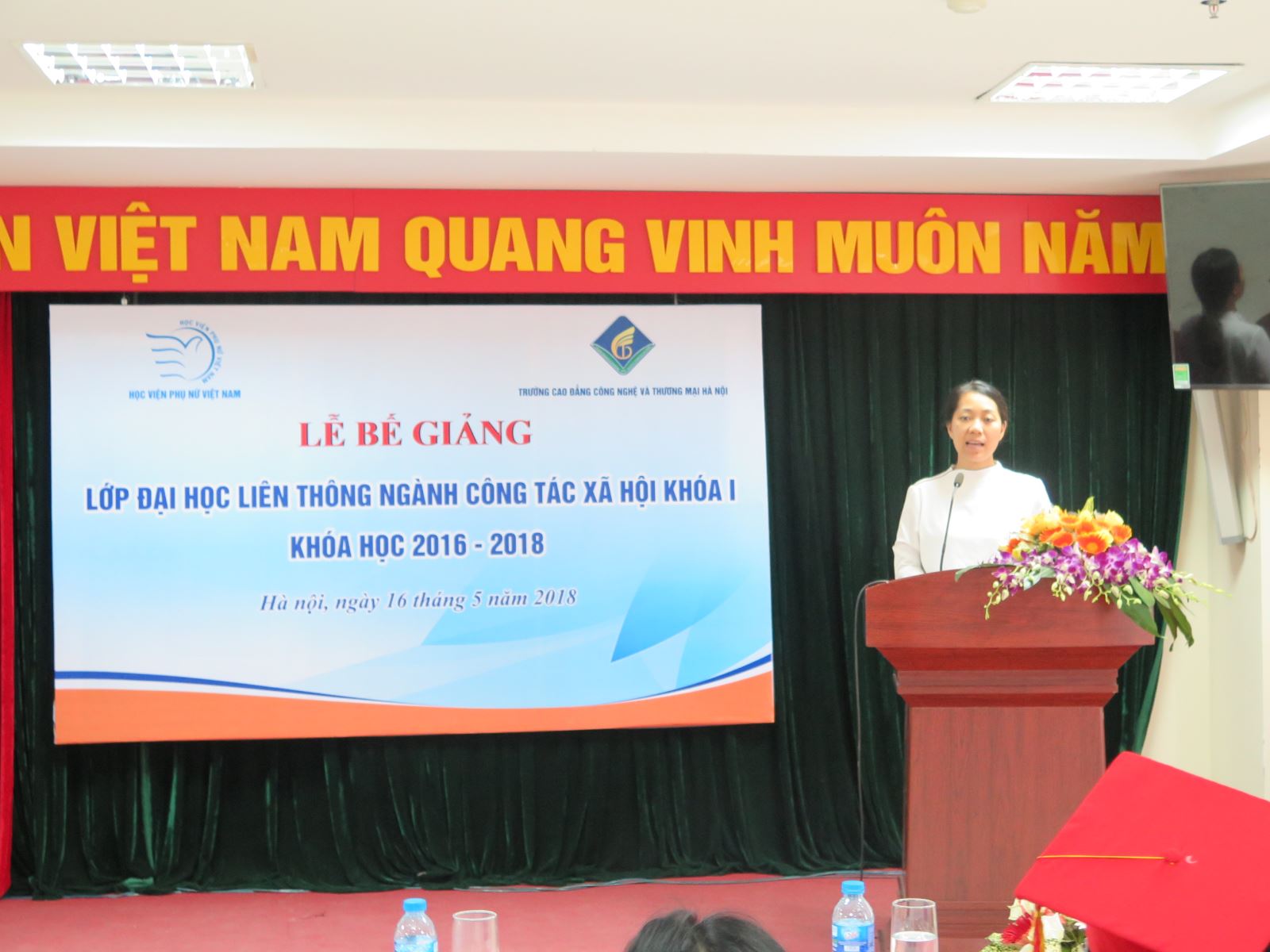 Tham dự lễ bế giảng có TS. Dương Kim Anh – Phó Giám đốc Học viện Phụ nữ Việt Nam. Về phía Trường cao đẳng Công nghệ và Thương mại Hà Nội có Ths. Đoàn Thị Thu Hương – Phó hiệu trưởng nhà trường và giảng viên tham gia giảng dạy khóa học. Đặc biệt, lễ bế giảng có sự tham gia của 36 tân cử nhân ngành Công tác xã hội khóa học 2016 – 2018.