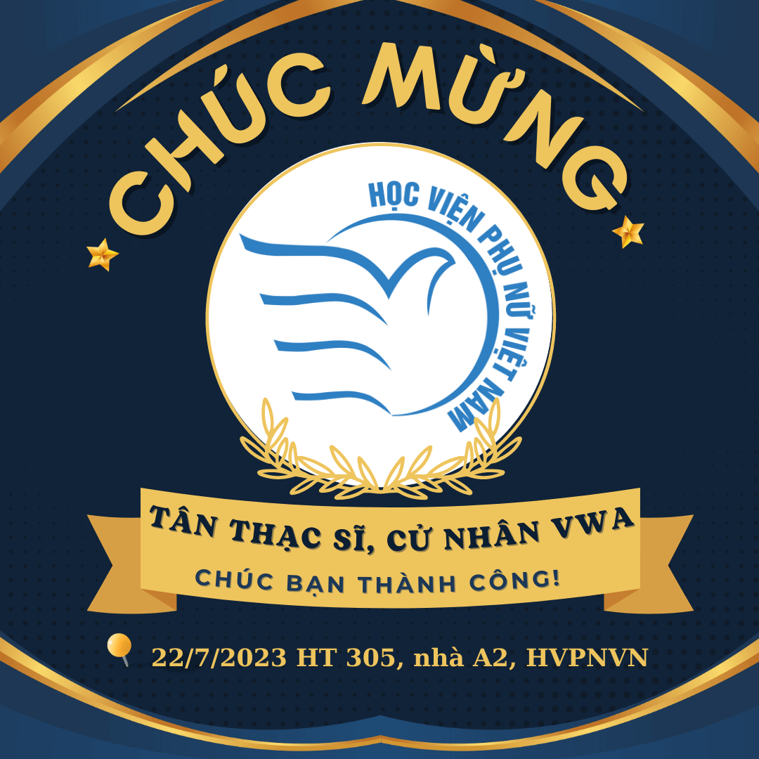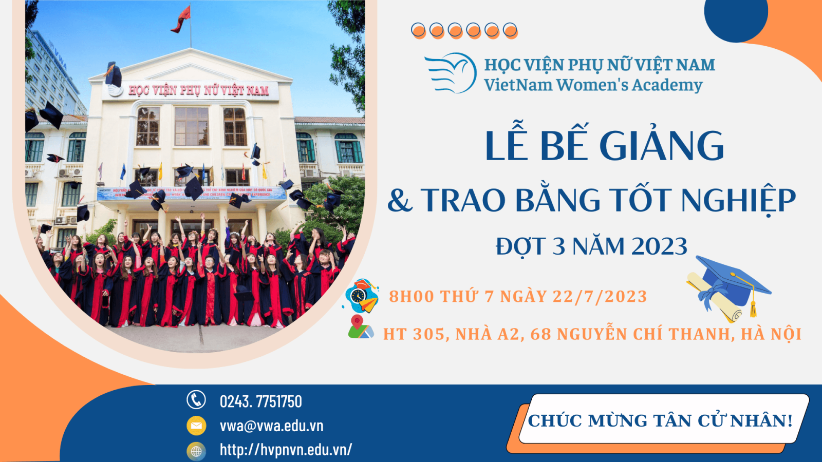 Học viện Phụ nữ Việt Nam trân trọng chào đón quý phụ huynh, các bạn học viên, sinh viên cùng đến tham dự Lễ bế giảng và trao bằng tốt nghiệp đợt 3 năm 2023 để cùng chúc mừng và nhân lên niềm vui, sự tự hào về thế hệ tương lai của đất nước.