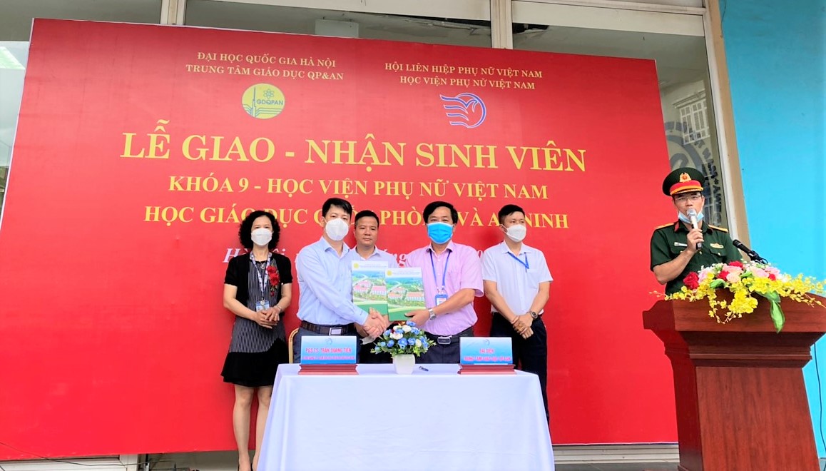 Đại diện Học viện Phụ nữ Việt Nam và Trung tâm Giáo dục quốc phòng an ninh ký biên bản bàn giao