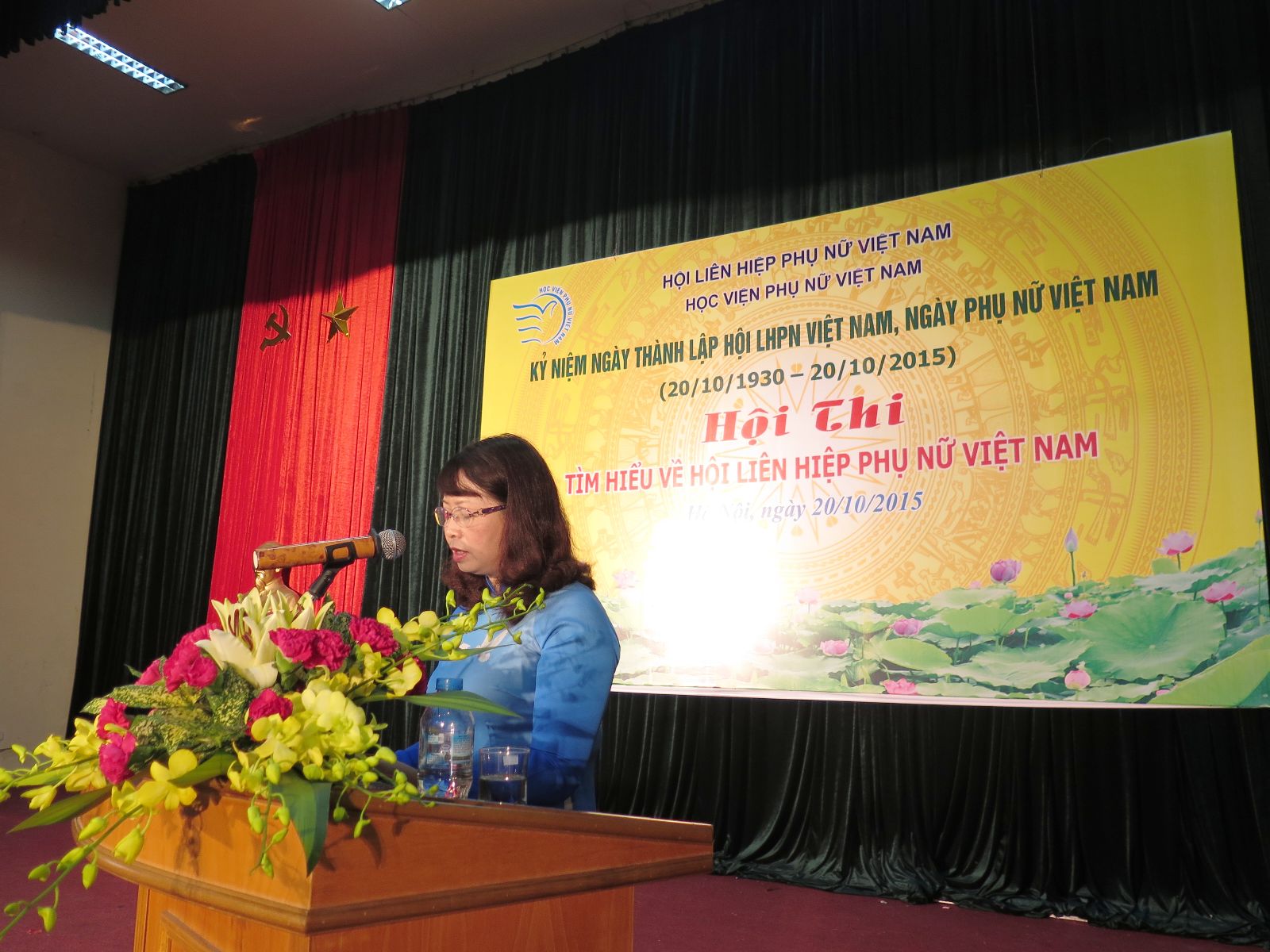 Mở đầu chương trình, TS. Bùi Thị Mai Đông – Trưởng khoa Công tác xã hội, Chi hội trưởng Chi hội Phụ nữ Học viện đã ôn lại truyền thống vẻ vang của người phụ nữ Việt “Kiên cường – Bất khuất – Trung hậu – Đảm đang”. Đồng chí cũng điểm lại quá trình hình thành và phát triển tổ chức Hội LHPN Việt Nam.  Dưới sự lãnh đạo của Đảng Cộng sản Việt Nam, Hội LHPN Việt Nam đã không ngừng lớn mạnh, trưởng thành, đã đoàn kết, tập hợp rộng rãi các tầng lớp phụ nữ Việt Nam phát huy truyền thống, phẩm chất tốt đẹp của các thế hệ phụ nữ đóng góp vào sự phát triển của đất nước. Hội ngày càng khẳng định được uy tín, vai trò của tổ chức duy nhất đại diện, chăm lo, bảo vệ quyền và lợi ích hợp pháp, chính đáng của các tầng lớp phụ nữ. Lễ kỉ niệm chính là dịp để mỗi phụ nữ Việt thắp lên tinh thần tự tin, tự trọng tiếp nối truyền thống vẻ vang của người phụ nữ Việt Nam trong thời kỳ Công nghiệp hóa – Hiện đại hóa đất nước.