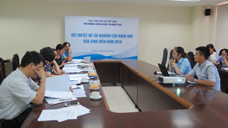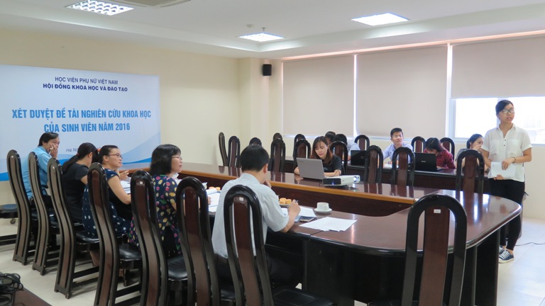 Năm 2016, Học viện tổ chức 02 đợt xét duyệt đề tài sinh viên, mỗi đợt xét duyệt 05-07 đề tài. Với 25 hồ sơ đề tài gửi về phòng Quản lý khoa học- Viện Nghiên cứu Phụ nữ trong đợt 1, đã có 13 đề tài thuộc 4 ngành đào tạo Công tác xã hội, Quản trị kinh doanh, Giới và phát triển, Luật được phê duyệt tên để xây dựng thuyết minh, trình Hội đồng xét duyệt. Học viện Phụ nữ Việt Nam tổ chức 04 buổi xét duyệt đề tài sinh viên thuộc 04 ngành đào tạo vào các ngày 22/6/2016, 24/6/2016, 27/6/2016, 29/6/2016.