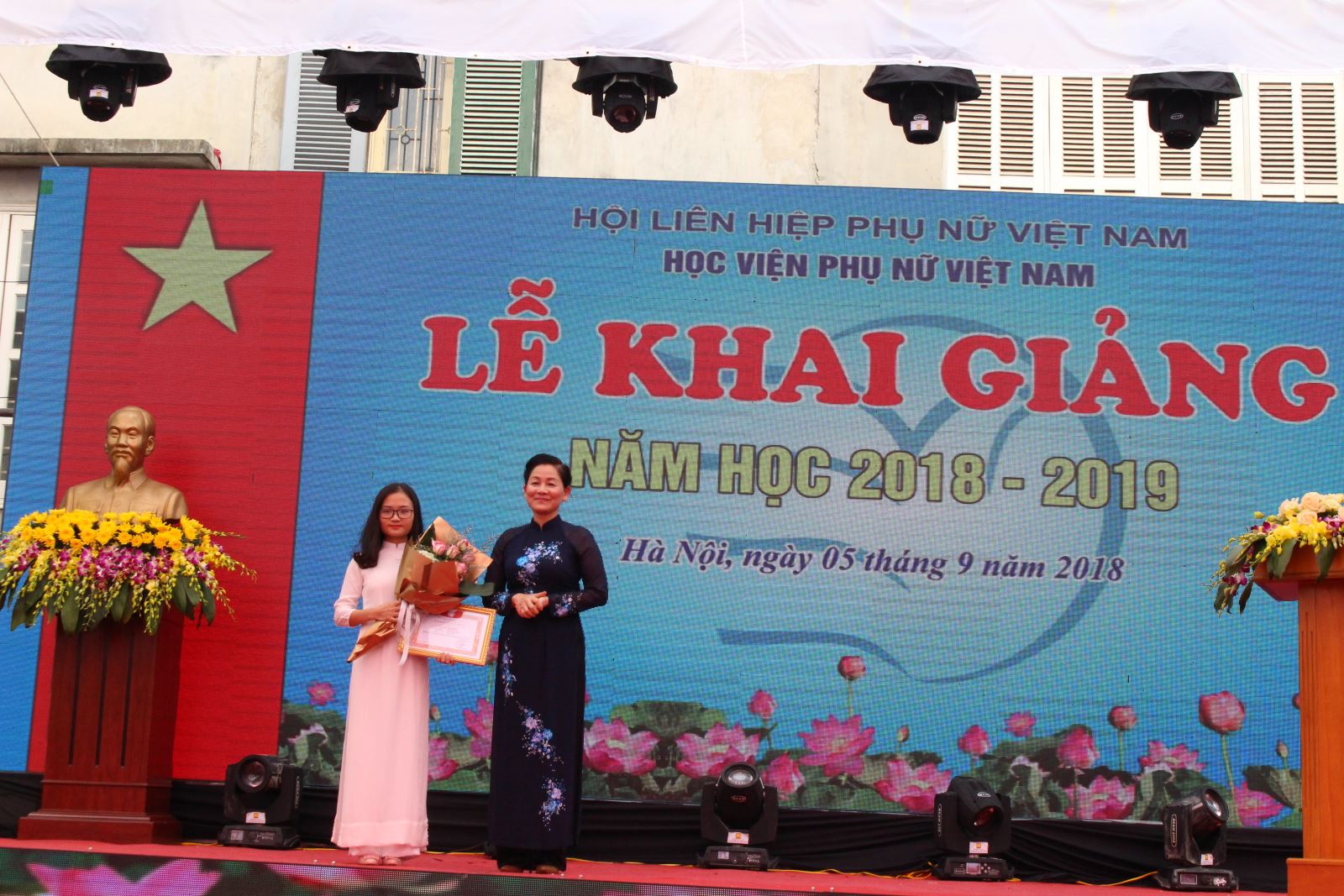 Phó Giám đốc học viện Hà Thị Thanh Vân trao học bổng và tặng hoa chúc mừng các tân sinh viên đạt điểm cao trong kỳ thi tốt nghiệp PTTH Quốc gia