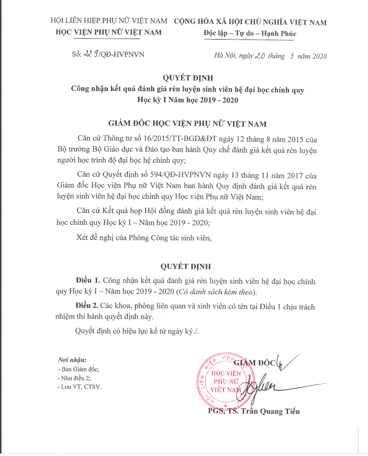 Tin tứcQuyết định công nhận đánh giá rèn luyện sinh viên HK1 năm học 2019 – 2020 Posted on Tháng Sáu 1, 2020 by admin(full) 01 Th6 Mời bạn đọc xem chi tiết Danh sách kèm theo Quyết định TẠI ĐÂY admin(full) Sinh viên Học viện Phụ nữ Việt Nam giao lưu cùng nhóm 1977 VlogQuyết định cấp học bổng khuyến khích học kỳ 1 năm học 2019 – 2020