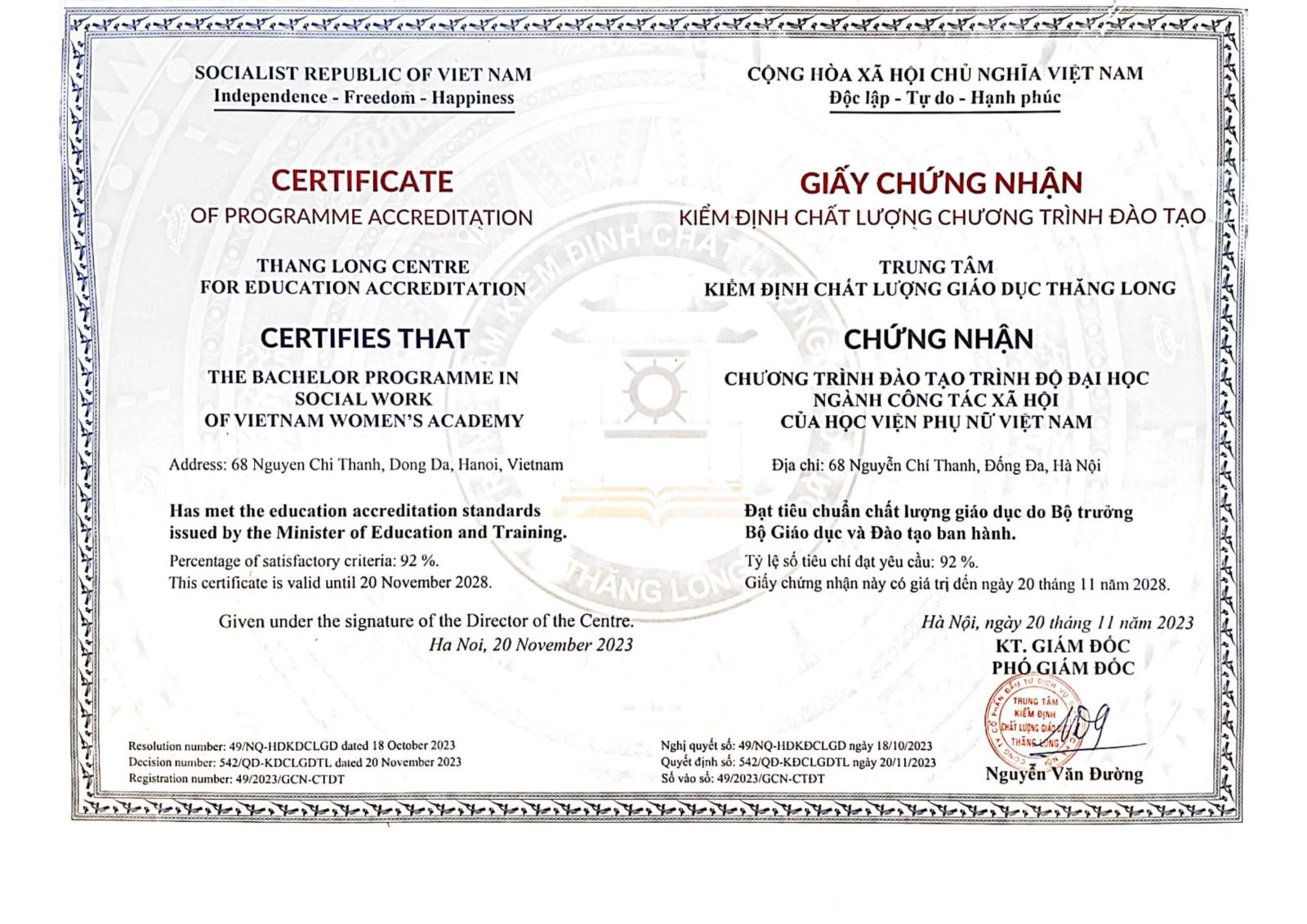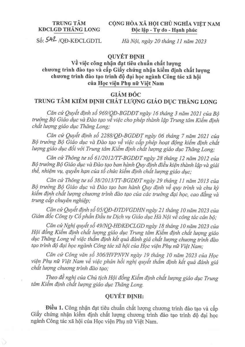 Dưới đây là Quyết định về việc đạt tiêu chuẩn chất lượng chương trình đào tạo và cấp Giấy kiểm định chất lượng chương trình đào tạo trình độ đại học ngành Công tác xã hội, Học viện Phụ nữ Việt Nam.