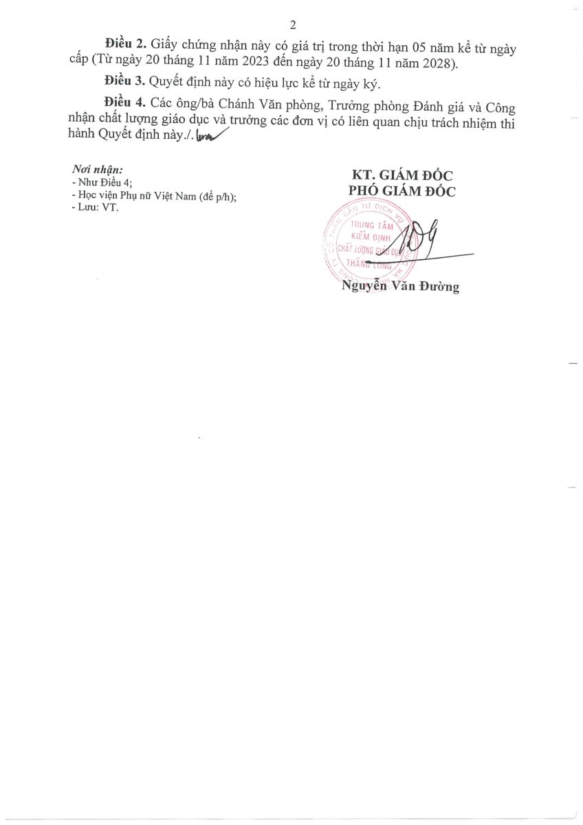 Học viện Phụ nữ Việt Nam và đại diện Trung tâm Kiểm định chất lượng giáo dục Thăng Long và đại diện Đoàn đánh giá ngoài đã thống nhất ký Biên bản hoàn thành chương trình khảo sát. Ngày 20/11/2023, Trung tâm Kiểm định chất lượng chất lượng giáo dục Thăng Long đã trao Giấy CN kiểm định cho 3 ngành Luật, Công tác xã hội và Quản trị kinh doanh.