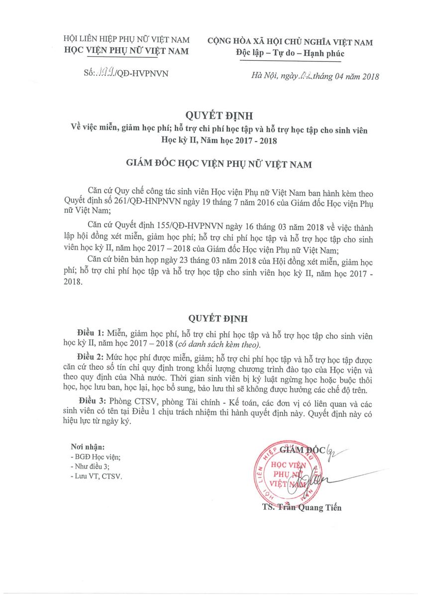 Quyết định về việc miễn giảm học phí, hỗ trợ chi phí học tập HK II năm học 2017 - 2018