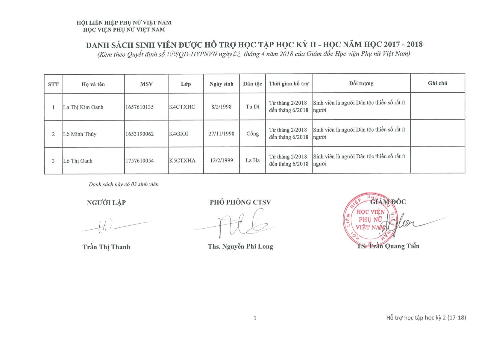 Danh sách sinh viên được hỗ trợ chi phí học tập