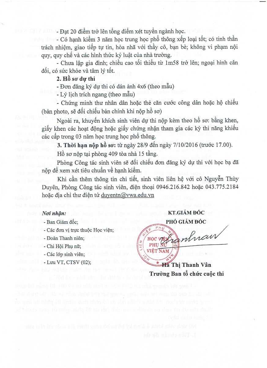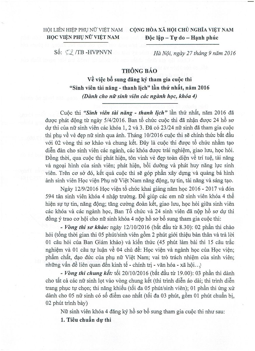 Tin tứcThông báo đăng ký bổ sung cuộc thi Sinh viên Tài năng – Thanh lịch dành cho K4 Posted on Tháng Chín 27, 2016 by admin(full) 27 Th9 Tải mẫu đơn đăng ký tham gia cuộc thi Sinh viên Tài năng – Thanh lịch TẠI ĐÂY Tải mẫu Sơ yếu lý lịch TẠI ĐÂY Hạn nộp hồ sơ: từ 28/9 đến ngày 7/10 (trước 17.00) Hồ sơ nộp tại phòng CTSV: P.409 nhà 15 tầng admin(full) Hội thảo tập huấn “Nền kinh tế chăm sóc và bình đẳng giới tại Việt Nam” Phương án tổ chức kỳ thi trung học phổ thông Quốc gia năm 2017