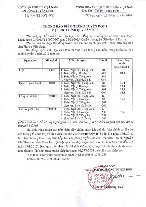 Tin tứcTHÔNG BÁO ĐIỂM TRÚNG TUYỂN ĐẠI HỌC CHÍNH QUY ĐỢT 1 – 2016 Posted on Tháng Tám 13, 2016 by admin(full) 13 Th8 admin(full) Học viện Phụ nữ Việt Nam mua trọn gói CSDL sách điện tử Emerald phục vụ công tác nghiên cứu, giảng dạy, học tậpDanh sách trúng tuyển đại học chính quy đợt 1 năm 2016