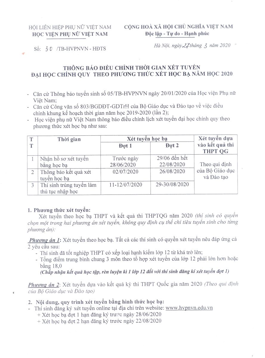 Tin tứcThông báo điều chỉnh thời gian xét tuyển đại học năm 2020 Posted on Tháng Ba 27, 2020 by admin(full) 27 Th3 admin(full) Học viện Phụ nữ Việt Nam ứng dụng phương pháp đào tạo trực tuyến trong điều kiện phòng, chống dịch Covid-19 Thông báo gia hạn thu học phí và hỗ trợ SV học trực tuyến