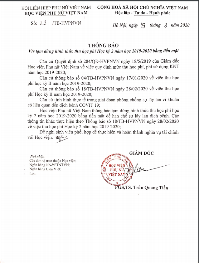 Tin tứcThông báo dừng hình thức thu học phí bằng tiền mặt Posted on Tháng Ba 9, 2020 by admin(full) 09 Th3 admin(full) Thông báo chuyển hình thức học tập trung sang hình thức học trực tuyến Học viện Phụ nữ Việt Nam ứng dụng phương pháp đào tạo trực tuyến trong điều kiện phòng, chống dịch Covid-19