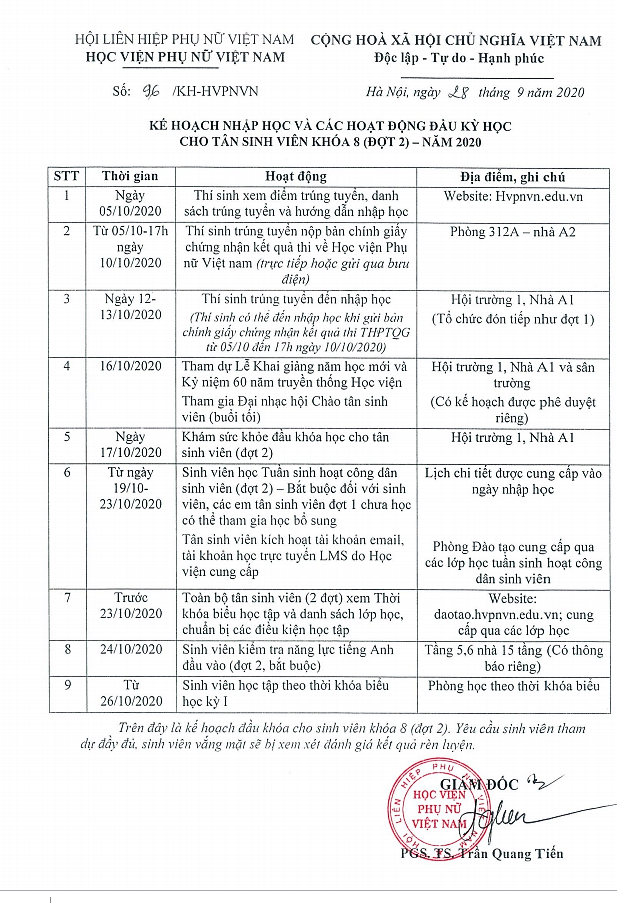 Thông báo kế hoạch nhập học của SV Khóa 8