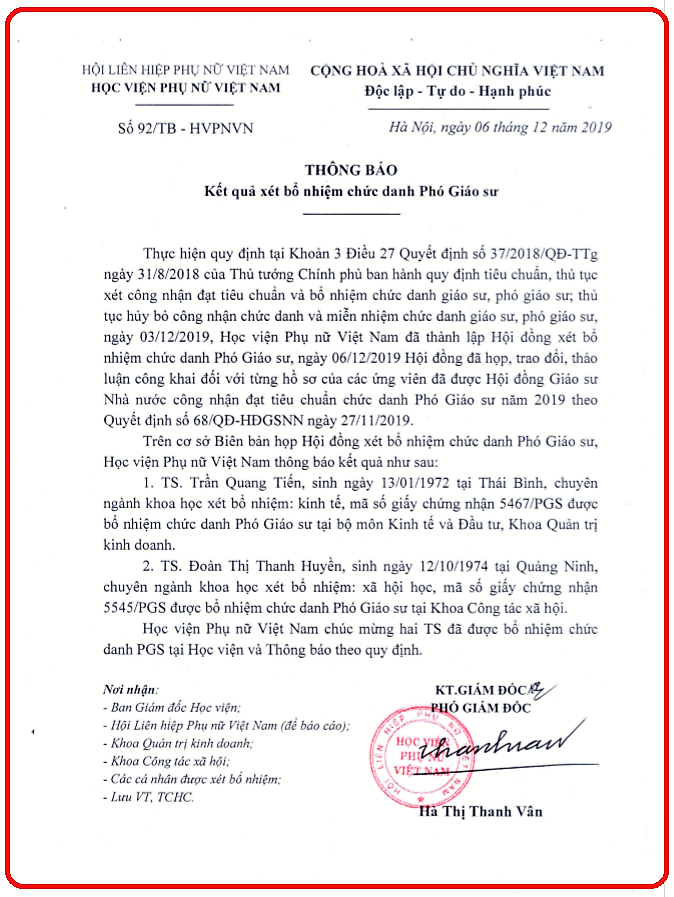 Thông báo kết quả xét bổ nhiệm chức danh Phó Giáo sư