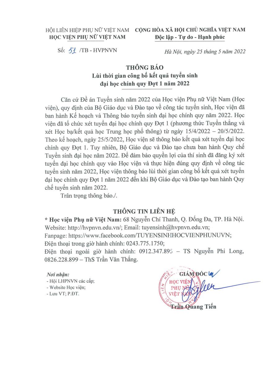 Tin tứcTHÔNG BÁO LÙI THỜI GIAN CÔNG BỐ KẾT QUẢ XÉT TUYỂN ĐỢT 1, 2022 Posted on Tháng Năm 25, 2022 by admin(full) 25 Th5 admin(full) Tập huấn công tác tuyển sinh 2022Sinh hoạt chuyên đề: “Đưa Nghị quyết Đại hội Phụ nữ toàn quốc lần thứ XIII vào cuộc sống”