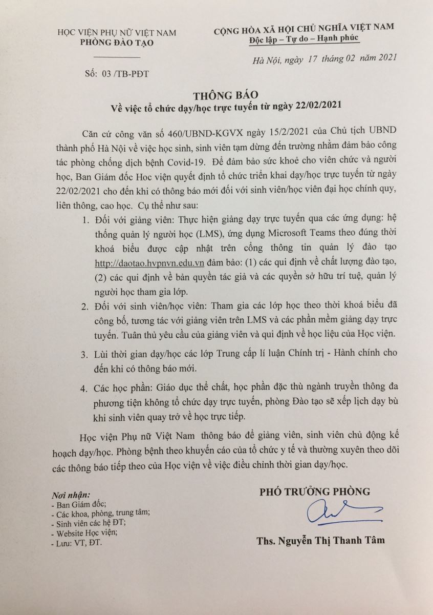Tin tứcThông báo tổ chức dạy/học trực tuyến từ ngày 22/02/2021 Posted on Tháng Hai 18, 2021 by admin(full) 18 Th2 admin(full) 6 SV Học viện Phụ nữ VN đạt học bổng du học Nga Tập huấn giảng dạy trên hệ thống quản lý học trực tuyến LMS