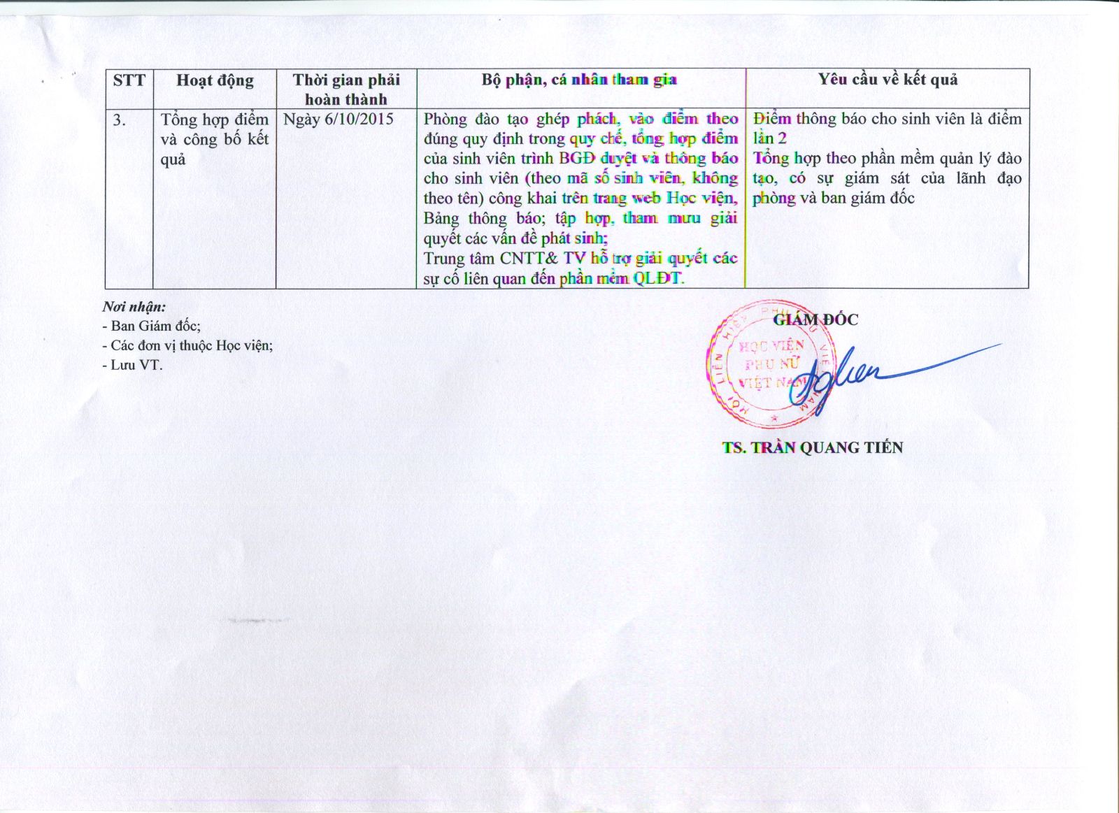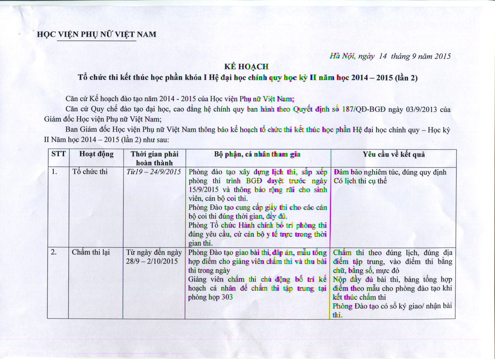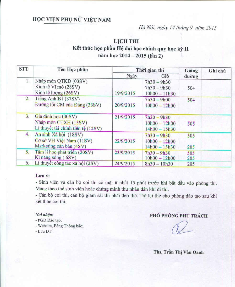 Thông báo về kế hoạch thi kết thúc học phần học kỳ II khóa I (lần II) 2014 – 2015