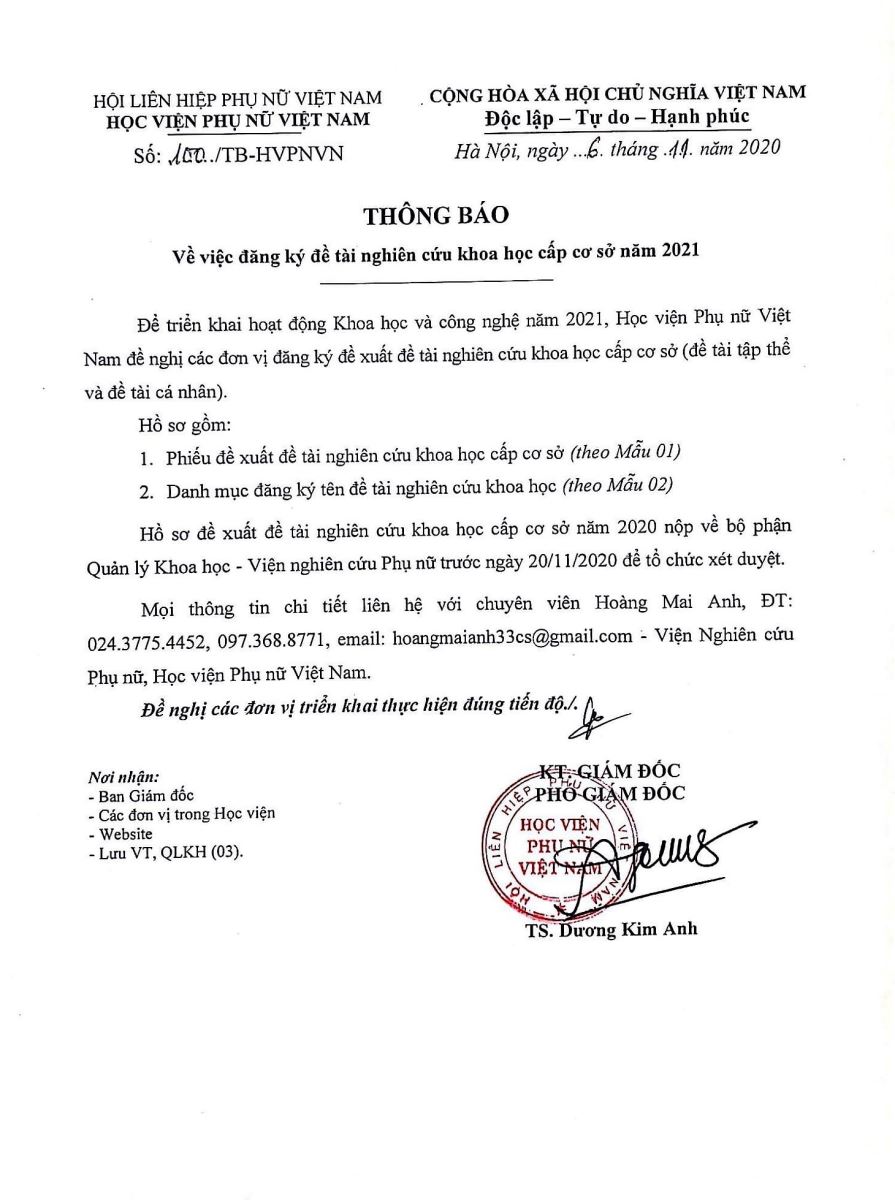 Tin tứcThông báo về việc đăng ký đề tài NCKH cấp cơ sở năm 2021 Posted on Tháng Mười Một 13, 2020 by admin(full) 13 Th11 Download Mẫu phiếu đề xuất đề tài NCKH (mẫu 1) và Danh mục đăng ký tên đề tài (Mẫu 2) TẠI ĐÂY admin(full) Danh sách thí sinh xét tuyển khóa 8 thiếu hồ sơ cần cập nhật P/s ảnh: Sinh hoạt chuyên đề Hội LHPNVN, địa chỉ đỏ trên các miền Tổ quốc