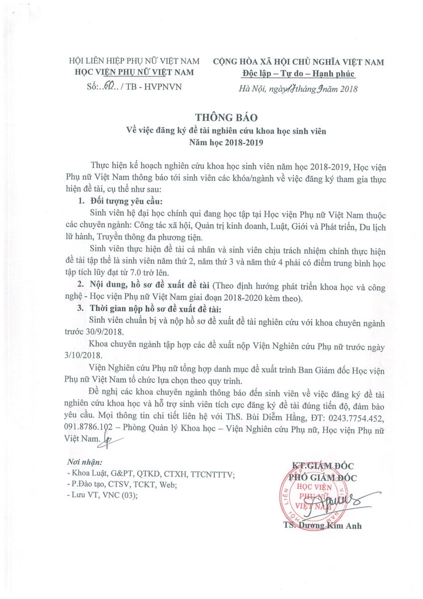 Tin tứcThông báo về việc đăng ký đề tài NCKH sinh viên năm 2018 – 2019 Posted on Tháng Chín 17, 2018 by admin(full) 17 Th9 Mời bạn đọc xem Định hướng phát triển khoa học công nghệ Học viện Phụ nữ Việt Nam giai đoạn 2018 – 2020 TẠI ĐÂY Xem Mẫu phiếu đề xuất đề tài NCKH sinh viên và Thông tin về sinh viên thực hiện đề tài TẠI ĐÂY admin(full) Kế hoạch tổ chức cuộc thi Nữ sinh thanh lịch 2018 Lớp liên thông đại học ngành CTXH thực hành Phát triển cộng đồng