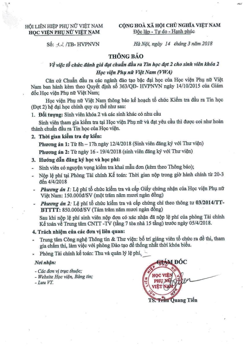 Thông báo về việc tổ chức thi đánh giá đạt chuẩn đầu ra Tin học (lần 2)
