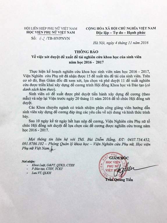 Tin tứcThông báo về việc xét duyệt đề tài NCKH của sinh viên năm học 2016 – 2017 Posted on Tháng Mười Một 7, 2016 by admin(full) 07 Th11 Tải danh sách đính kèm TẠI ĐÂY admin(full) Giới thiệu Hội thảo KH Quốc tế về Công tác xã hội Đoàn đại biểu quốc tế tham quan Trung tâm chữa bệnh, giáo dục lao động xã hội II