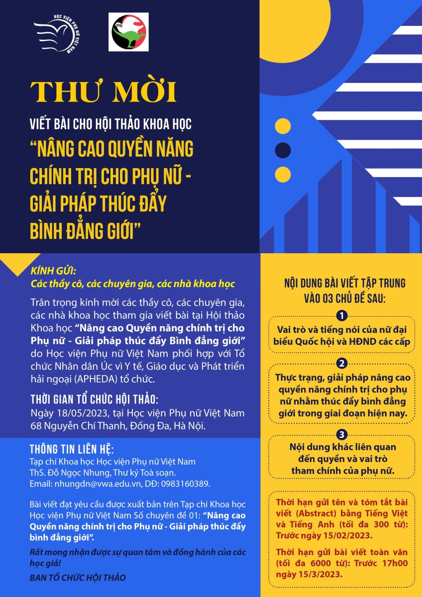 Tin tứcThư mời viết bài HT khoa học: “Nâng cao quyền năng chính trị cho phụ nữ – Giải pháp thúc đẩy bình đẳng giới” Posted on Tháng Một 19, 2023 by admin(full) 19 Th1 admin(full) Thông báo đăng ký đề tài NCKH cấp cơ sở năm 2023 (bổ sung) ĐỀ ÁN TUYỂN SINH ĐẠI HỌC NĂM 2023